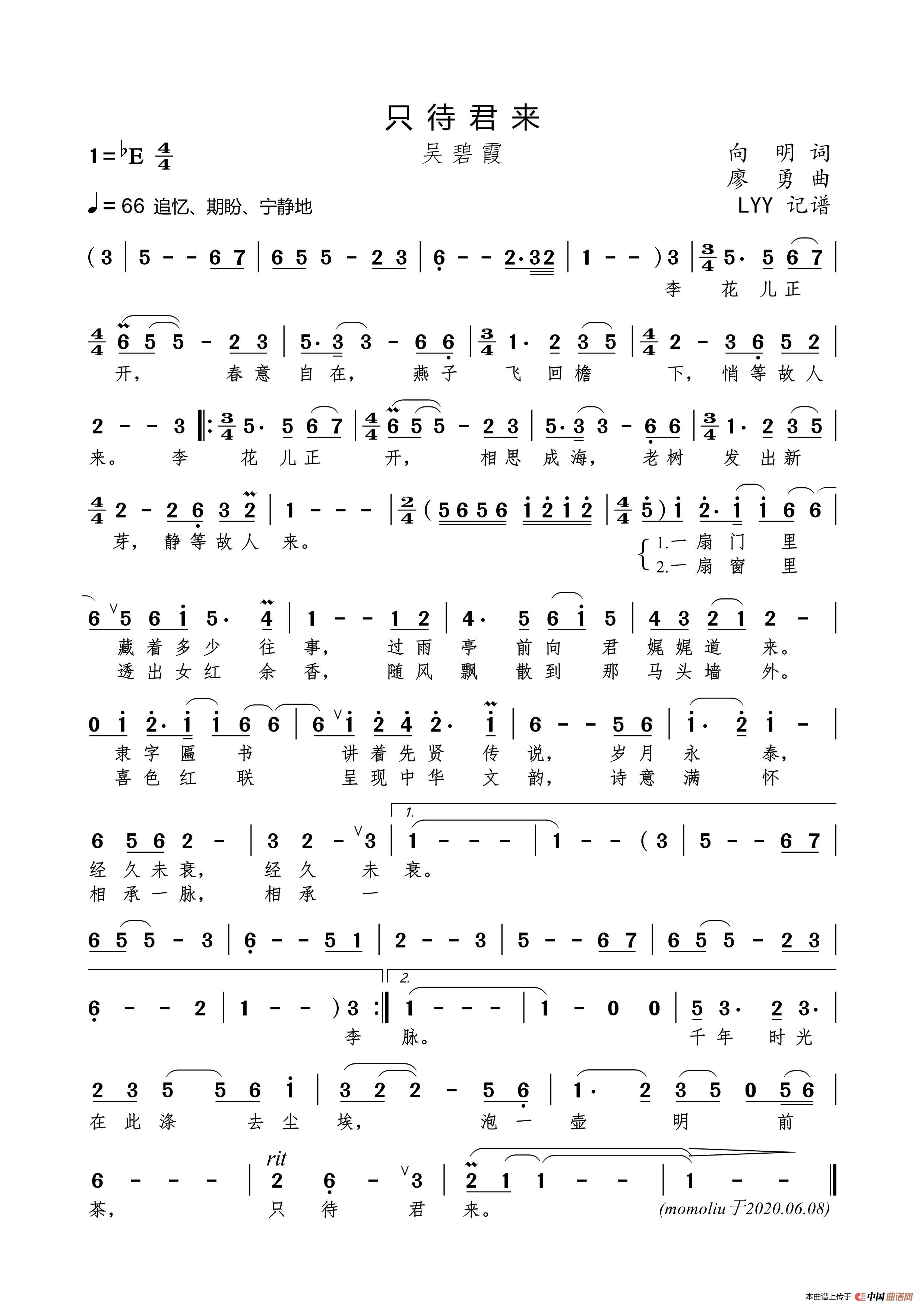 由著名曲作家廖勇作曲,词作家向明作词,歌唱家吴碧霞演唱的《只待君来》,让古老的画栋朱帘,枯藤老树,仿佛又鲜活了起来 。