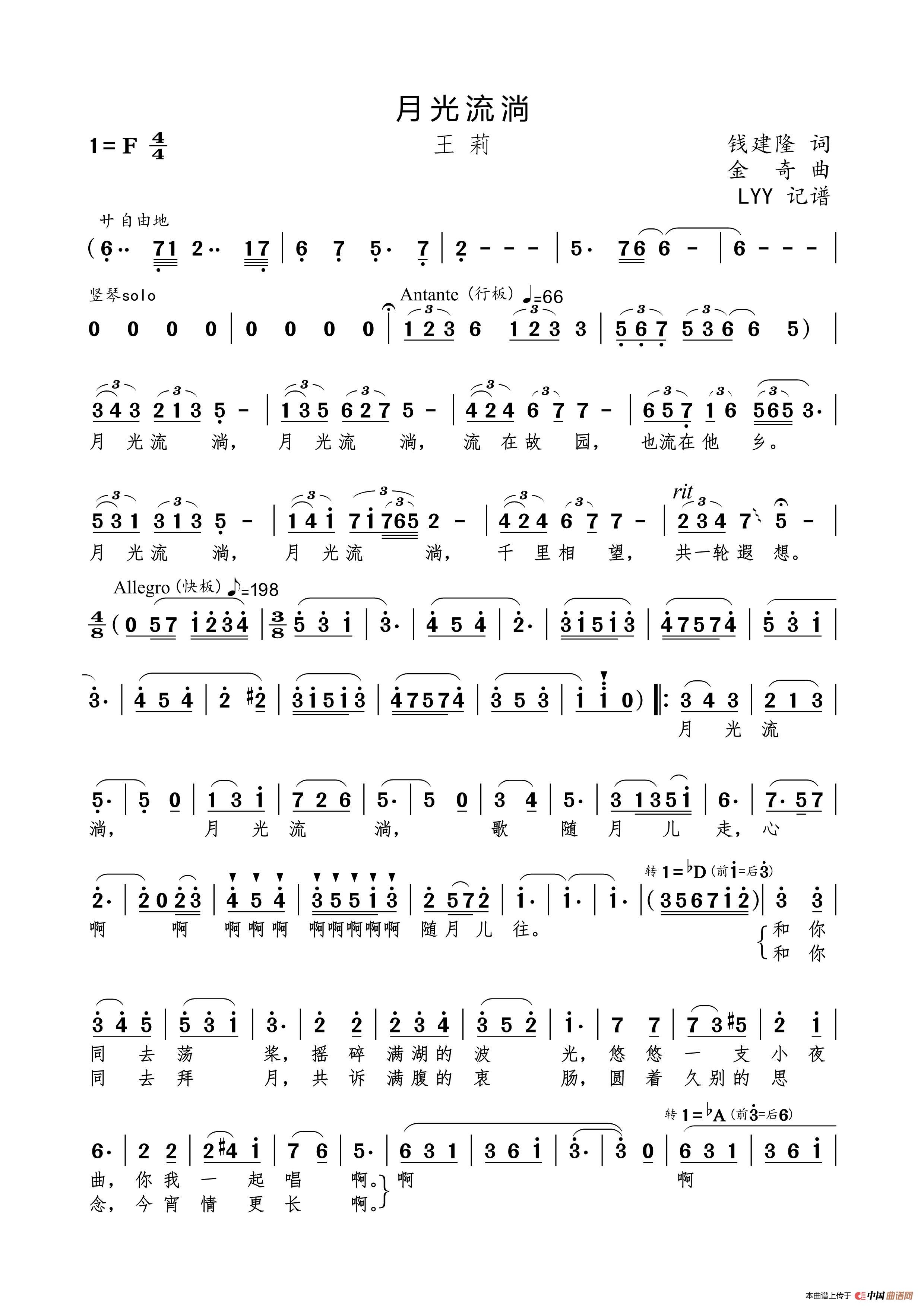 正是这短短的四行歌词激发了我的创造遐想,我用复三部的结构写成了一首比例上音乐大大超过歌词、让词作家钱建隆惊诧的作品。钱先生当即决定重新填词。他花了一晚上时间填写出的与旋律天衣无缝的歌词让人拍案叫绝。首唱这首作品的是我的夫人赵俊,当年她带着这首作品一路过关斩将杀入中央电视台第四届青年歌手大奖赛的决赛现场,将这首作品展示给了全国的听众。金铁霖和张越男两位前辈还在评论现场专门褒扬了这部作品。这部作品1988年获浙江省第二届音乐舞蹈节音乐创作二等奖;1994年刊登在全国专业音乐核心刊物《音乐创作》中;1996年被中央音乐学院收入《声乐教材》出版;2000年由西南师大出版社收入《21世纪音乐教材声乐曲选》出版;2009年收入我第三张个人创作作品专辑《南方雨》中,由空政歌舞团著名青年女高音歌唱家王莉演唱,中国音乐家音像出版社出版。2011年收入“《会唱歌的月亮》—金奇抒情声乐曲选”由中央音乐学院出版社出版。