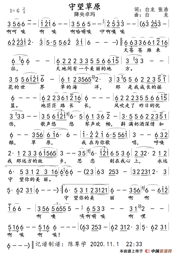 作词:白龙 张浩   作曲:白龙   演唱(奏):降央卓玛   来源:谱友陈尊学上传   上传:陈尊学   日期:2020-11-03   浏览次数: