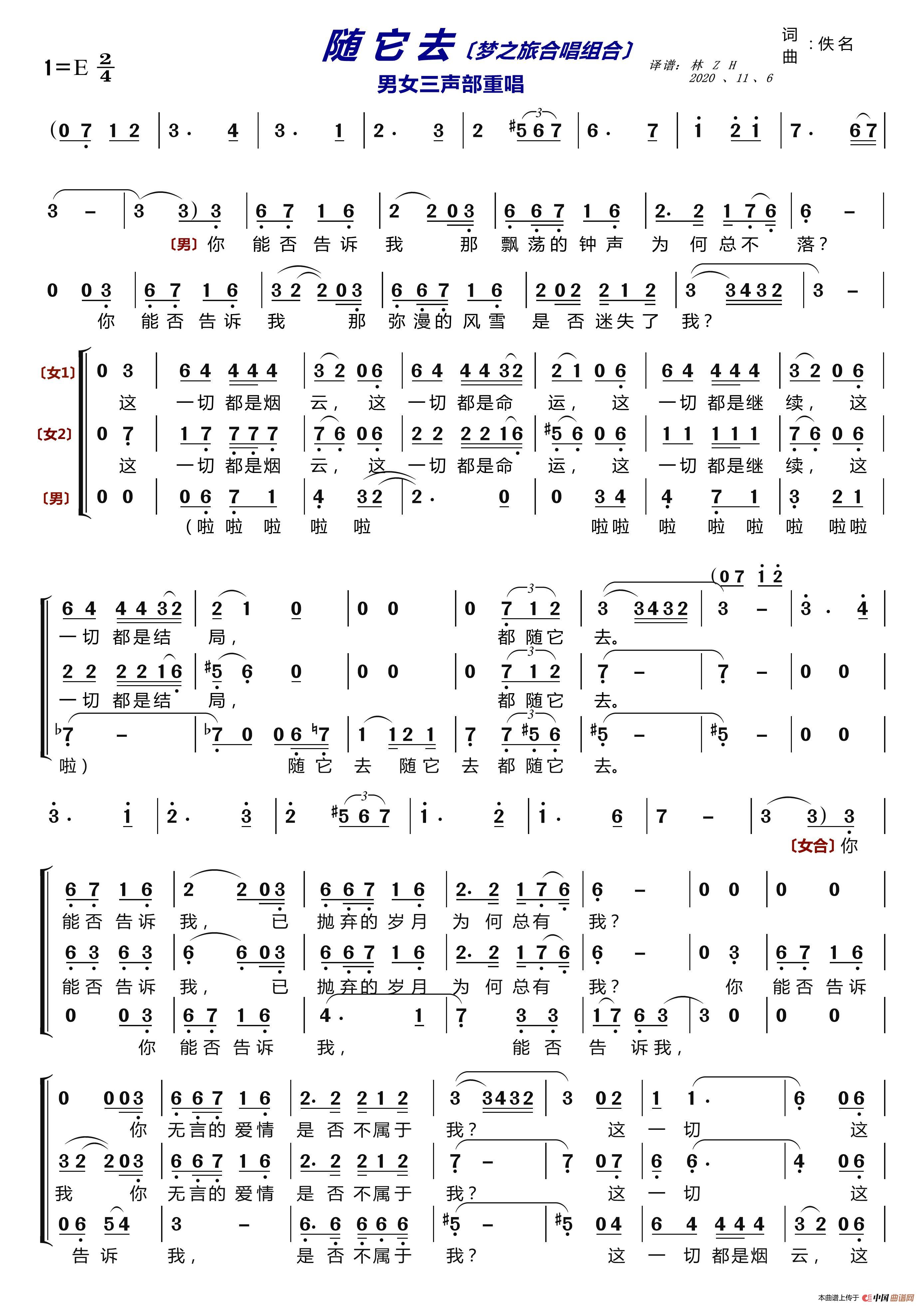 关于《随它去〔梦之旅合唱组合〕》曲谱的评论