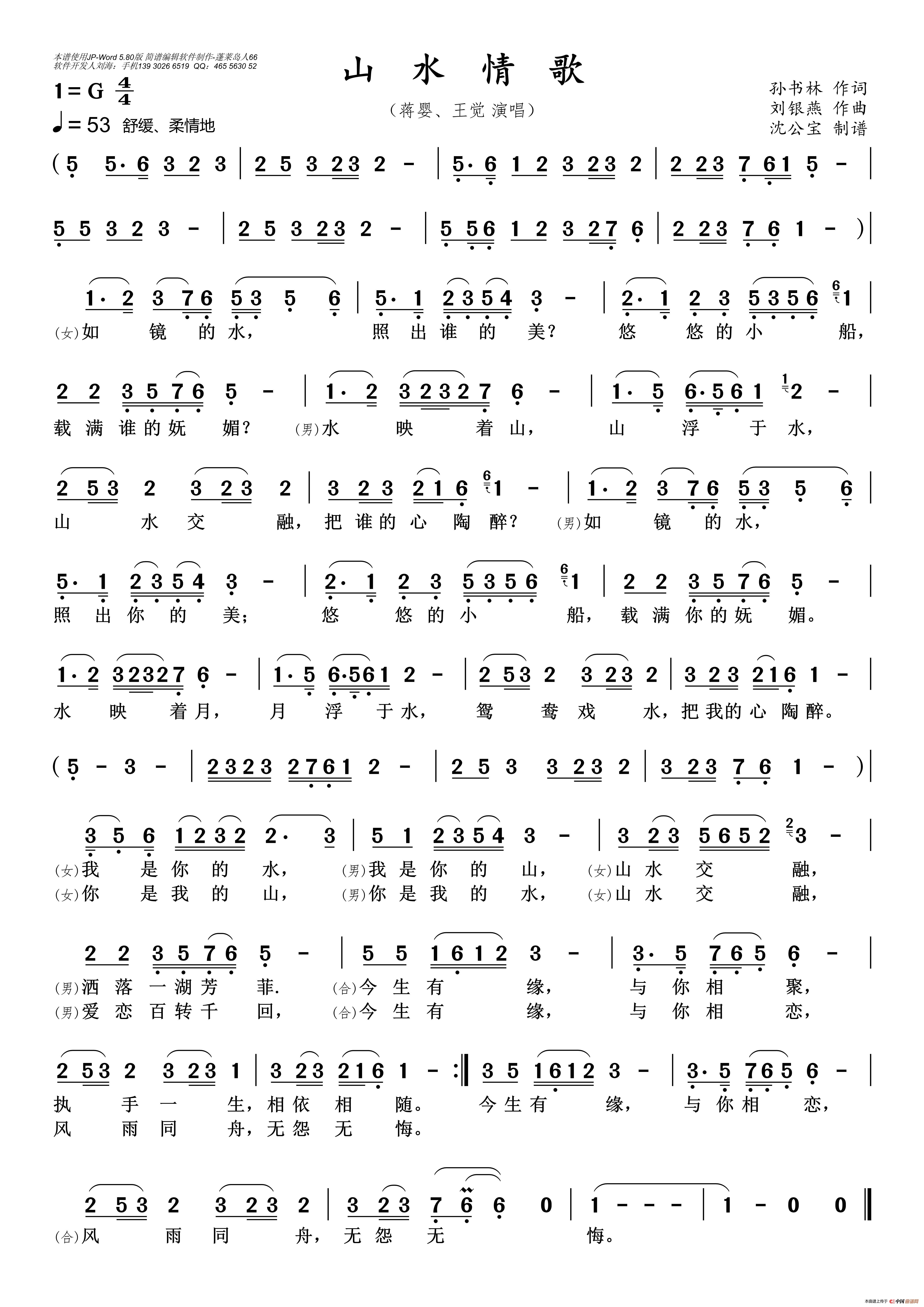 女:你是我的山,男: 你是我的水,女: 山水交融,男:爱恋百转千回,合:今生有缘,与你相恋,风雨同舟,无怨无悔。