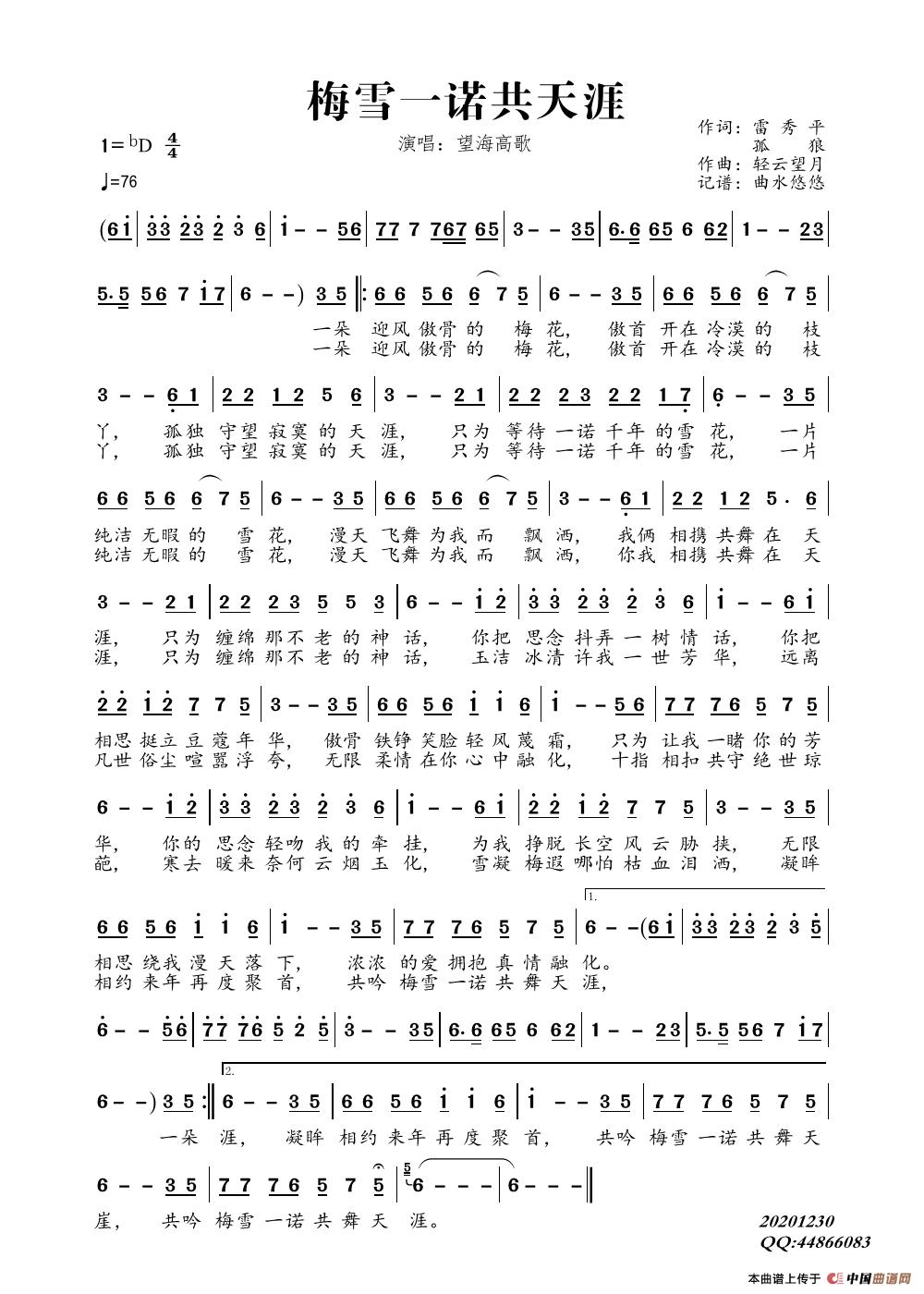 关于《梅雪一诺共天涯》曲谱的评论