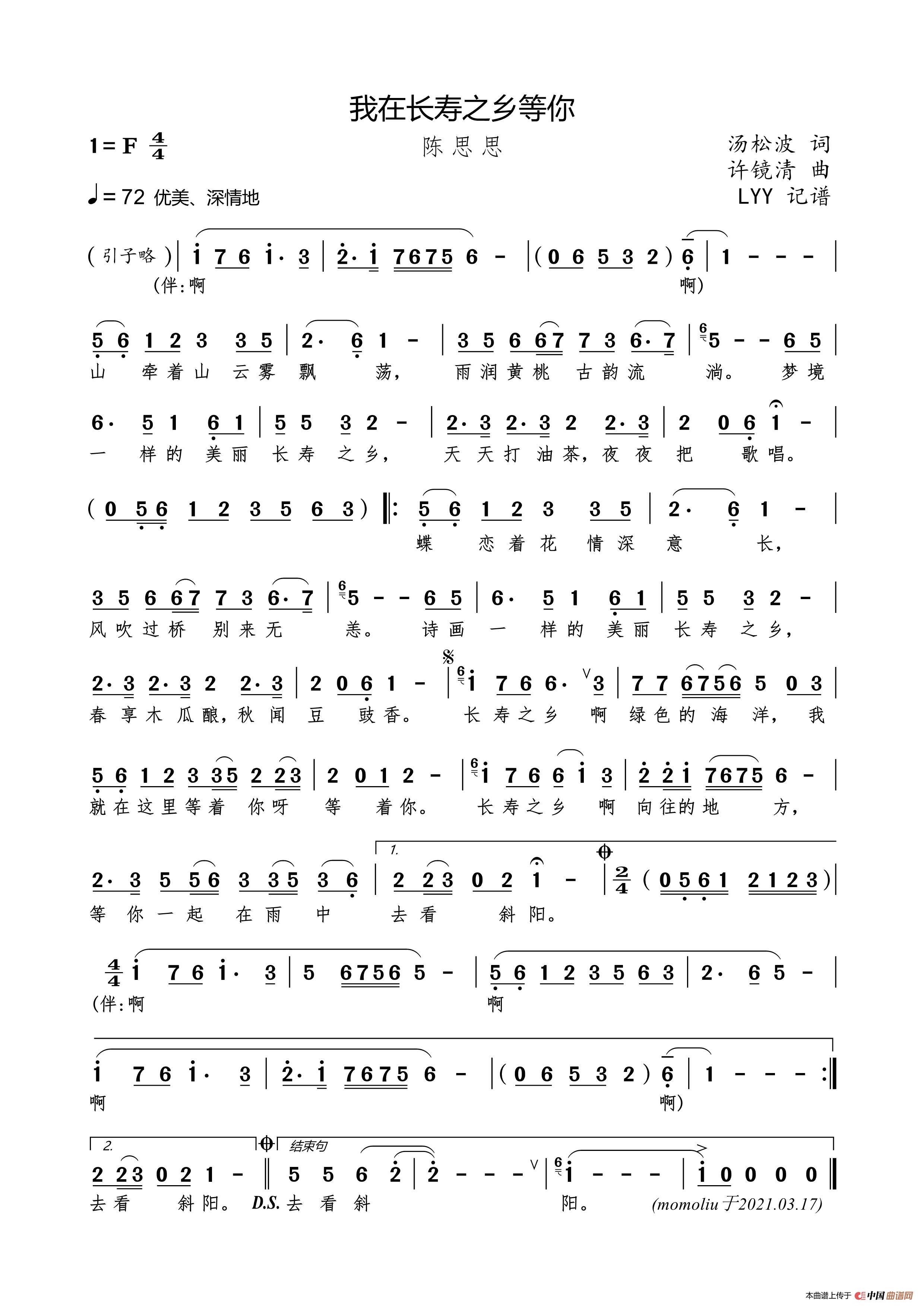 简介:《我在长寿之乡等你》是我国首台百家姓主题大型旅游演艺《寻根黄姚》压轴主题曲,也是中国首个全域长寿市广西贺州城市旅游形象推广歌曲,由1986版《西游记》总作曲许镜清作曲、著名词作家汤松波作词、央视春晚制作人方珲编曲、著名歌唱家陈思思演唱,歌词如诗如画,旋律优美动听,演唱到位极具感染力,让人恍惚身临其境,不觉产生对黄姚古镇这一座千年古镇和贺州这一个世界长寿之乡的向往。