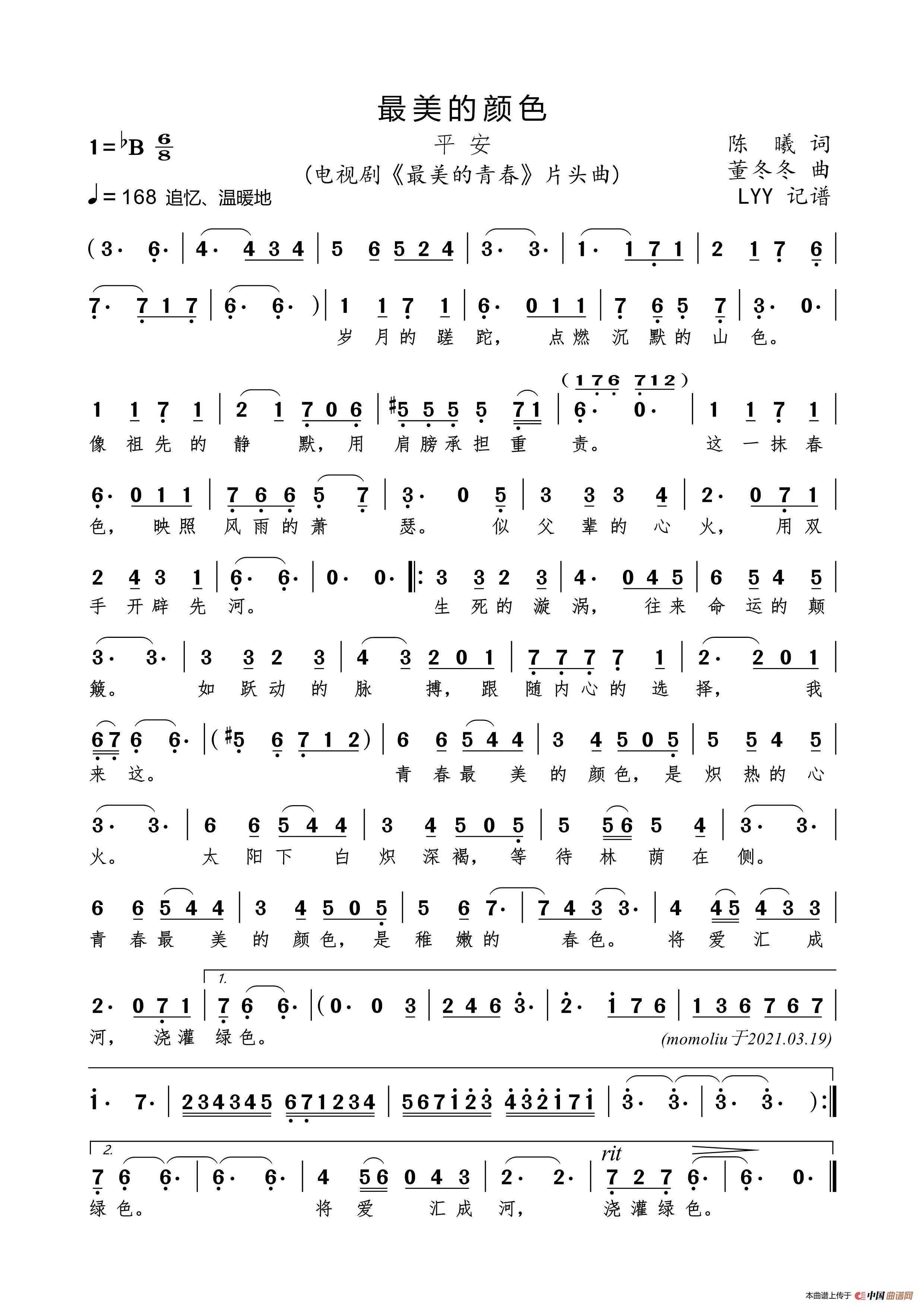 简介:刘智扬、何雨虹领衔主演的绿色青春剧《最美的青春》,真实再现了塞罕坝造林人,为保护环境,几十年如一日的奋斗精神。片头曲《最美的颜色》由平安演唱。悠扬的风琴和口琴声缓缓而起,让人的思绪如涟漪般荡开,仿佛置身于塞罕坝造林人“用双手开辟先河”的青春岁月。 平安的声音表现力自不用说,清澈嘹亮的音色纵横捭阖,寥廓恣意,随着节奏感十足的旋律,炽热的心火逐渐被点燃,他高亮的嗓音唱出了造林人员战严寒、斗酷暑、抛青春、洒热血、壮丽的人生诗篇。而歌词字里行间都透着“暖意”——“青春最美的颜色/是稚嫩的春色/将爱汇成河/浇灌绿色”,整首歌曲大气稳重又不失温暖,饱含着一种恢弘而诗意的家园情怀。