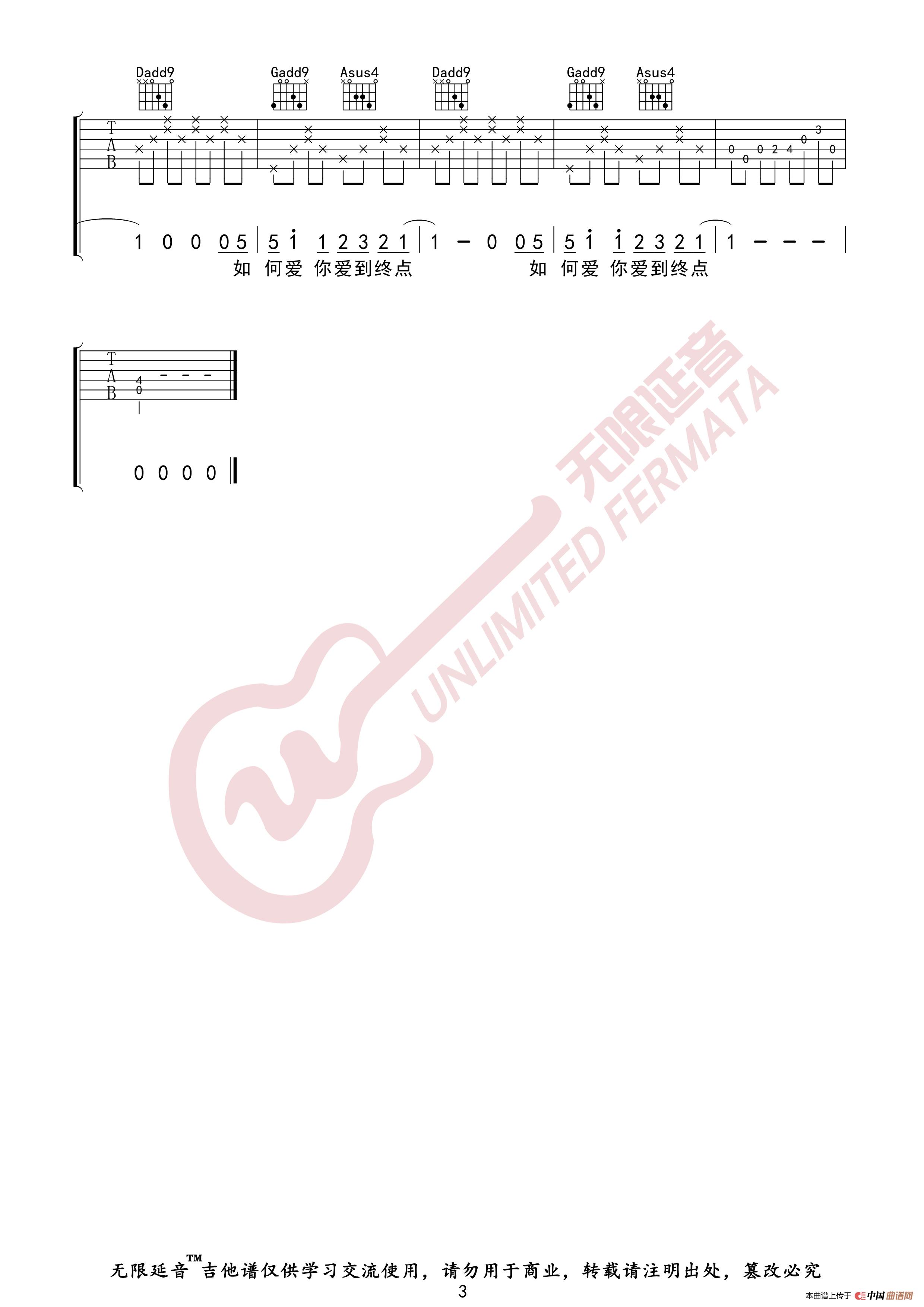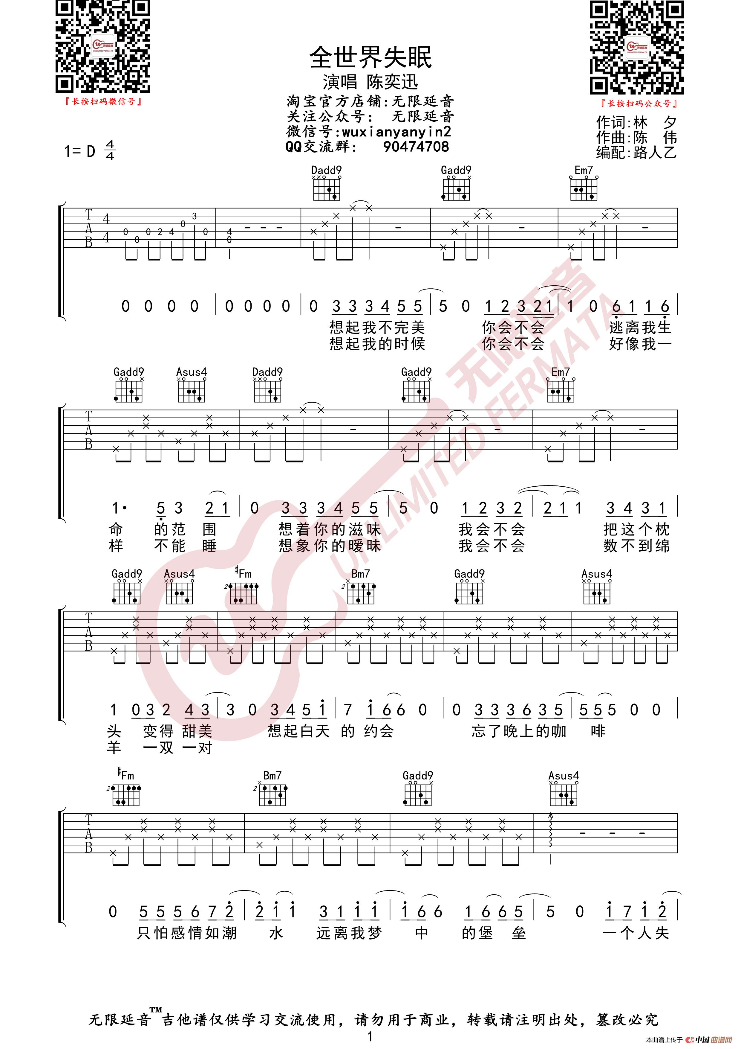 陈奕迅 全世界失眠 吉他谱(无限延音编配)