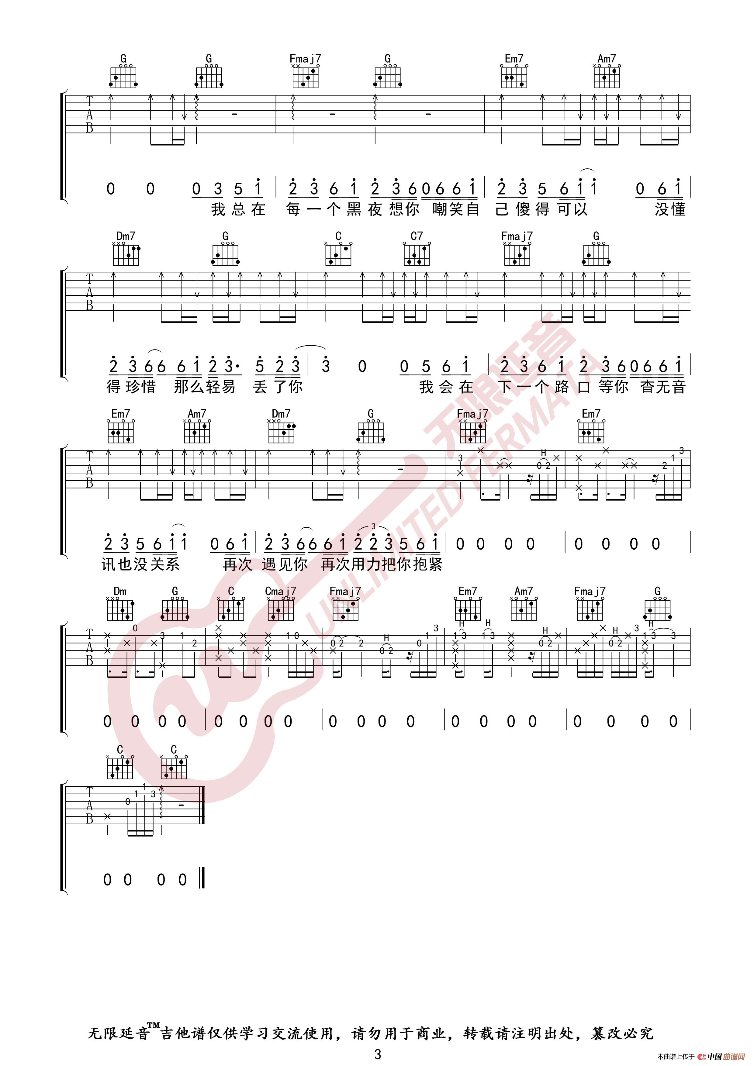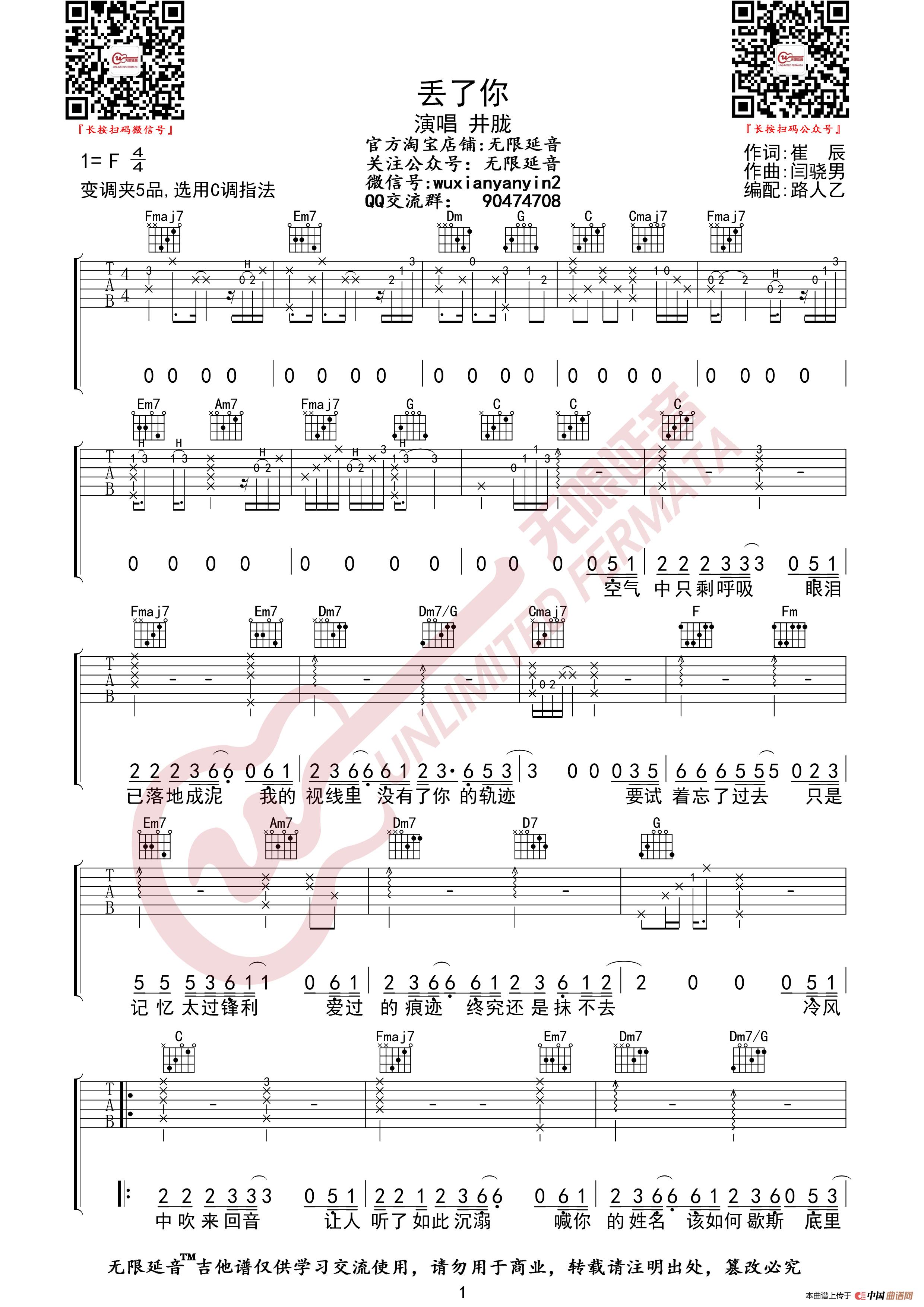 井胧 丢了你 吉他谱(无限延音编配)