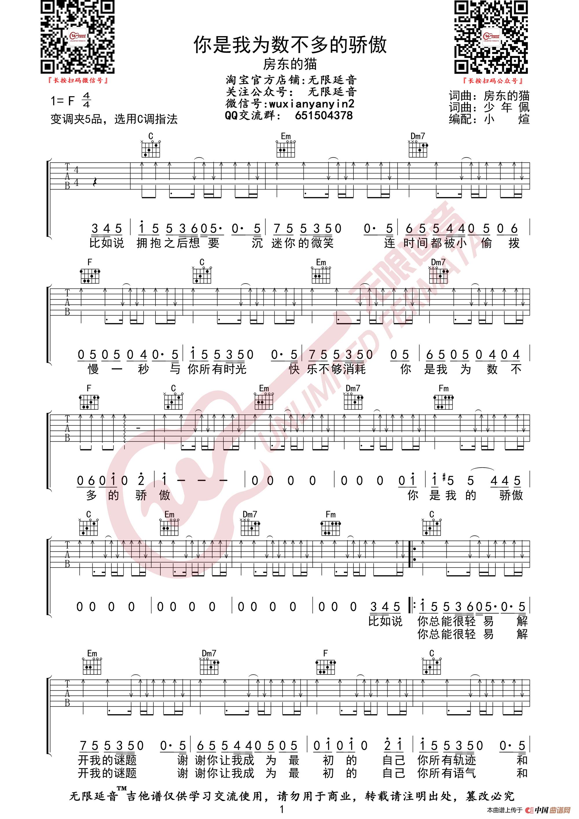 房东的猫 你是我为数不多的骄傲 吉他谱(无限延音编配)