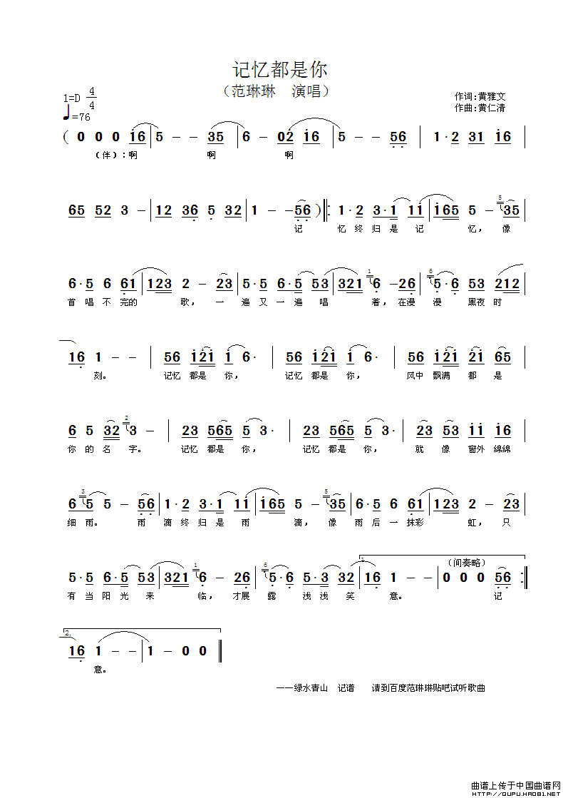 作词:黄雅文   作曲:黄仁清   演唱(奏):范琳琳   格式:简谱   来源:谱友绿水青山   上传:绿水青山   日期:2011-09-29   浏览次数: