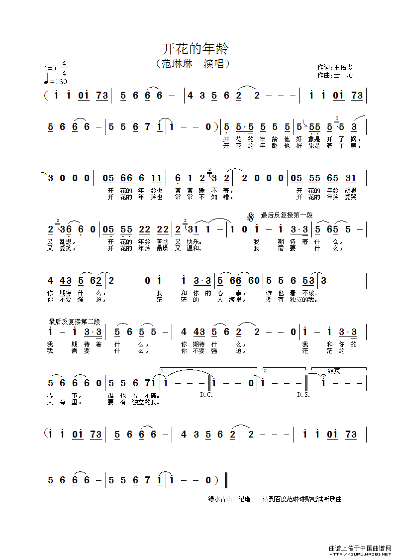作词:王佑贵   作曲:士心   演唱(奏):范琳琳   格式:简谱   来源:谱友绿水青山   上传:绿水青山   日期:2011-09-30   浏览次数: