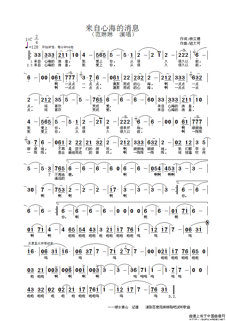 作词:杨立德   作曲:钮大可   演唱(奏):范琳琳   格式:简谱   来源:谱友绿水青山   上传:绿水青山   日期:2011-09-30   浏览次数: