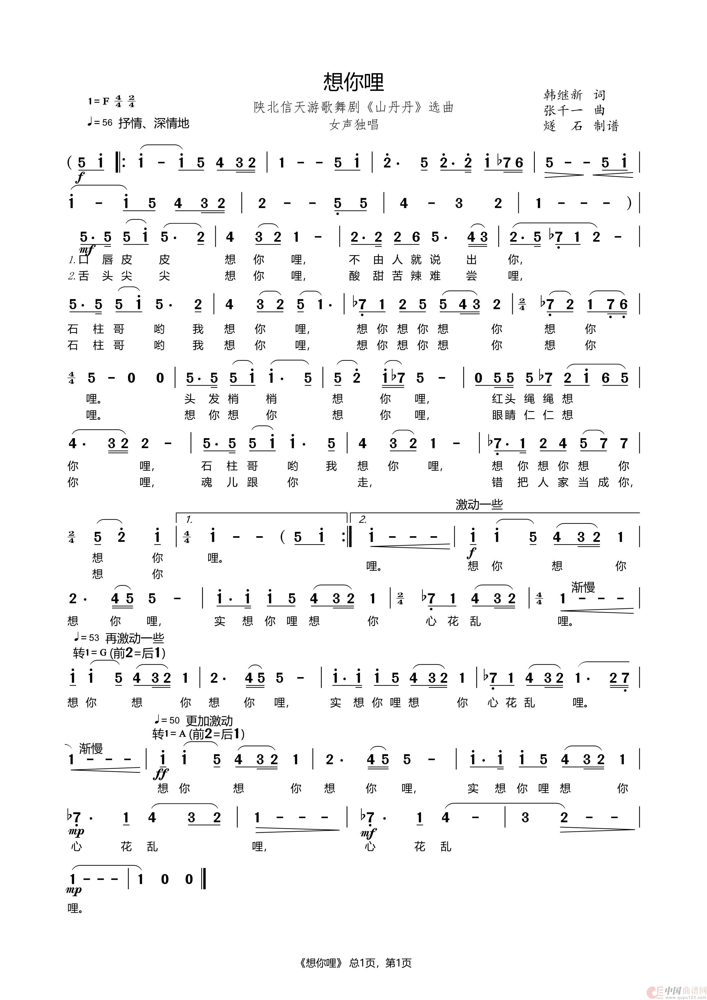 关于《想你哩》曲谱的评论