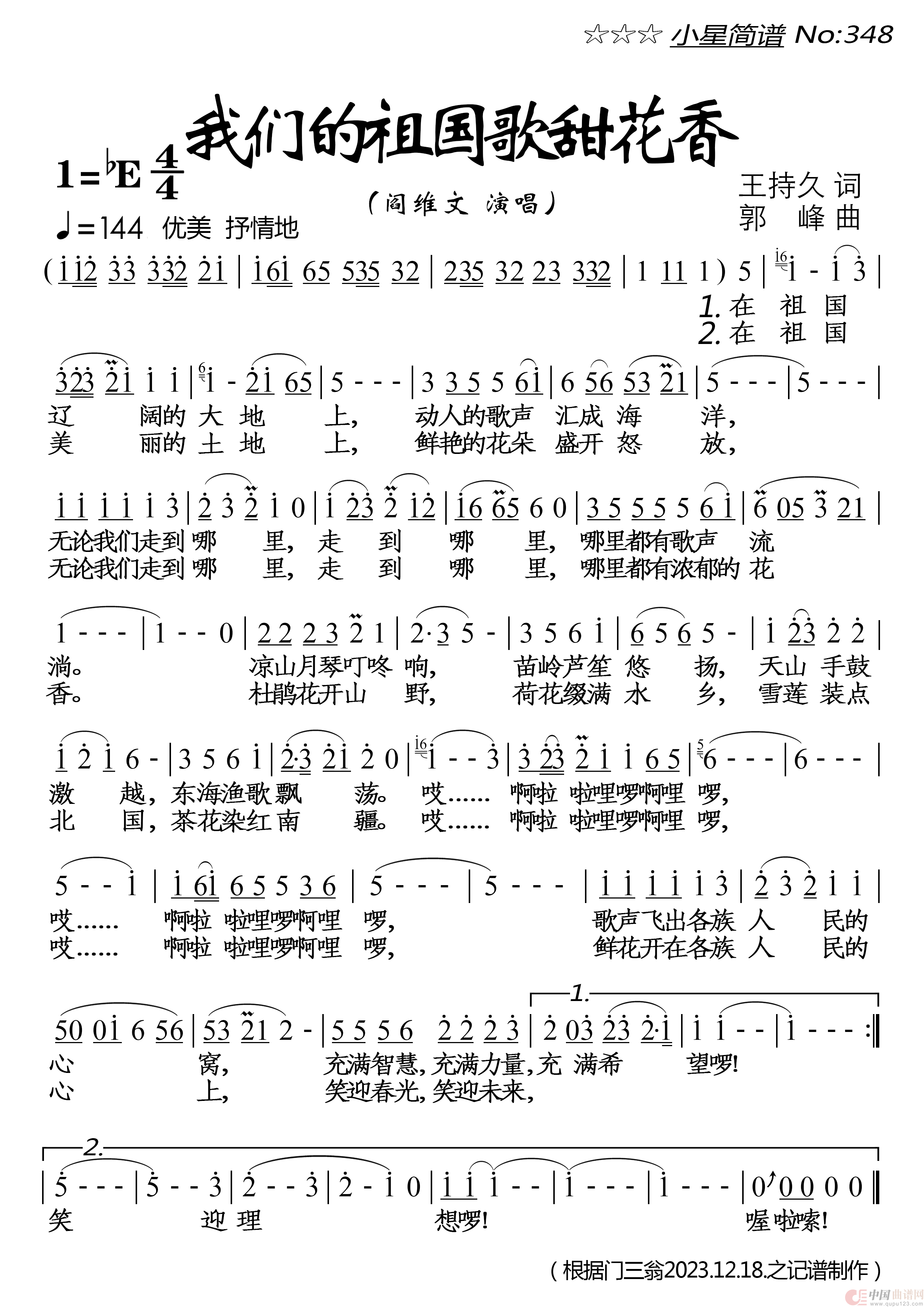 关于《我们的祖国歌甜花香》曲谱的评论