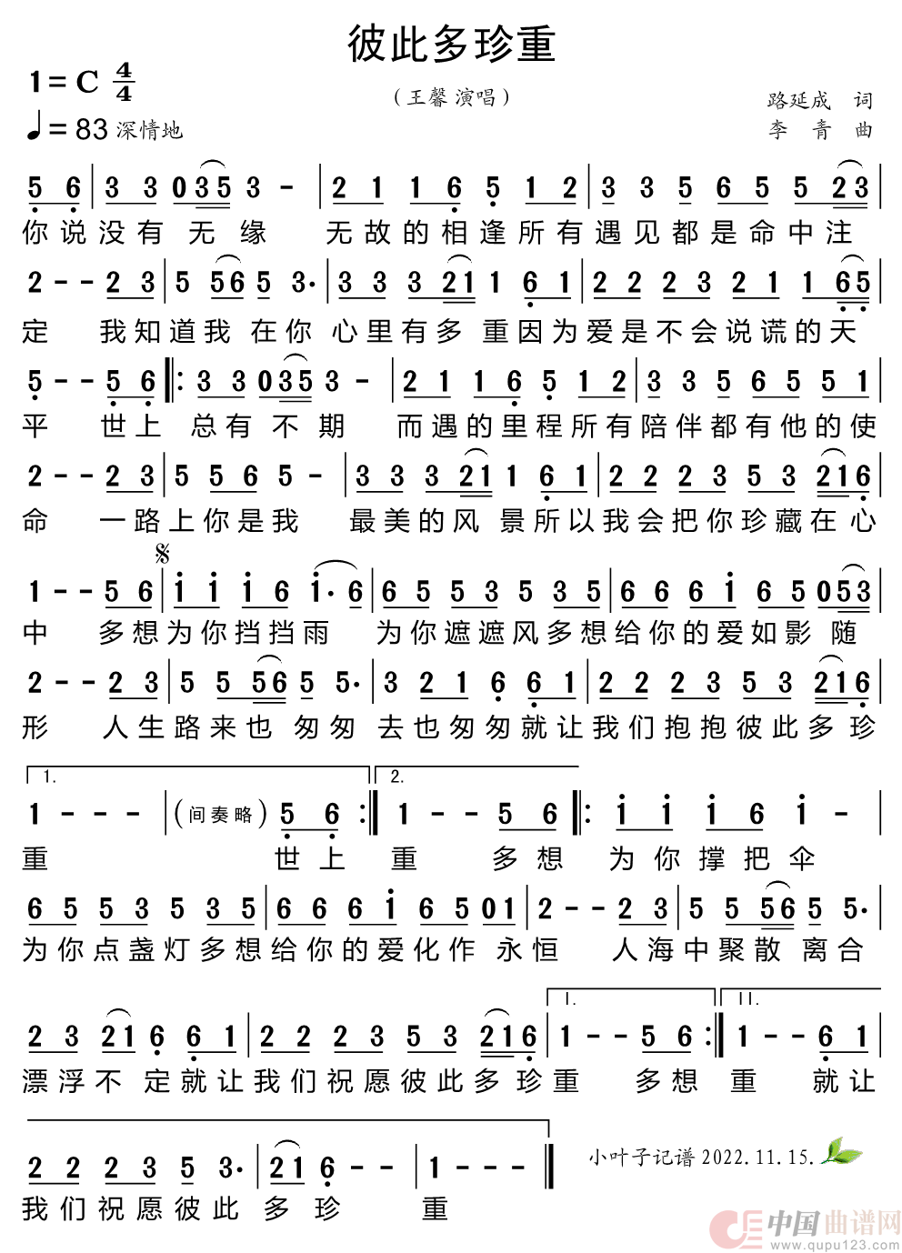 关于《彼此多珍重》曲谱的评论