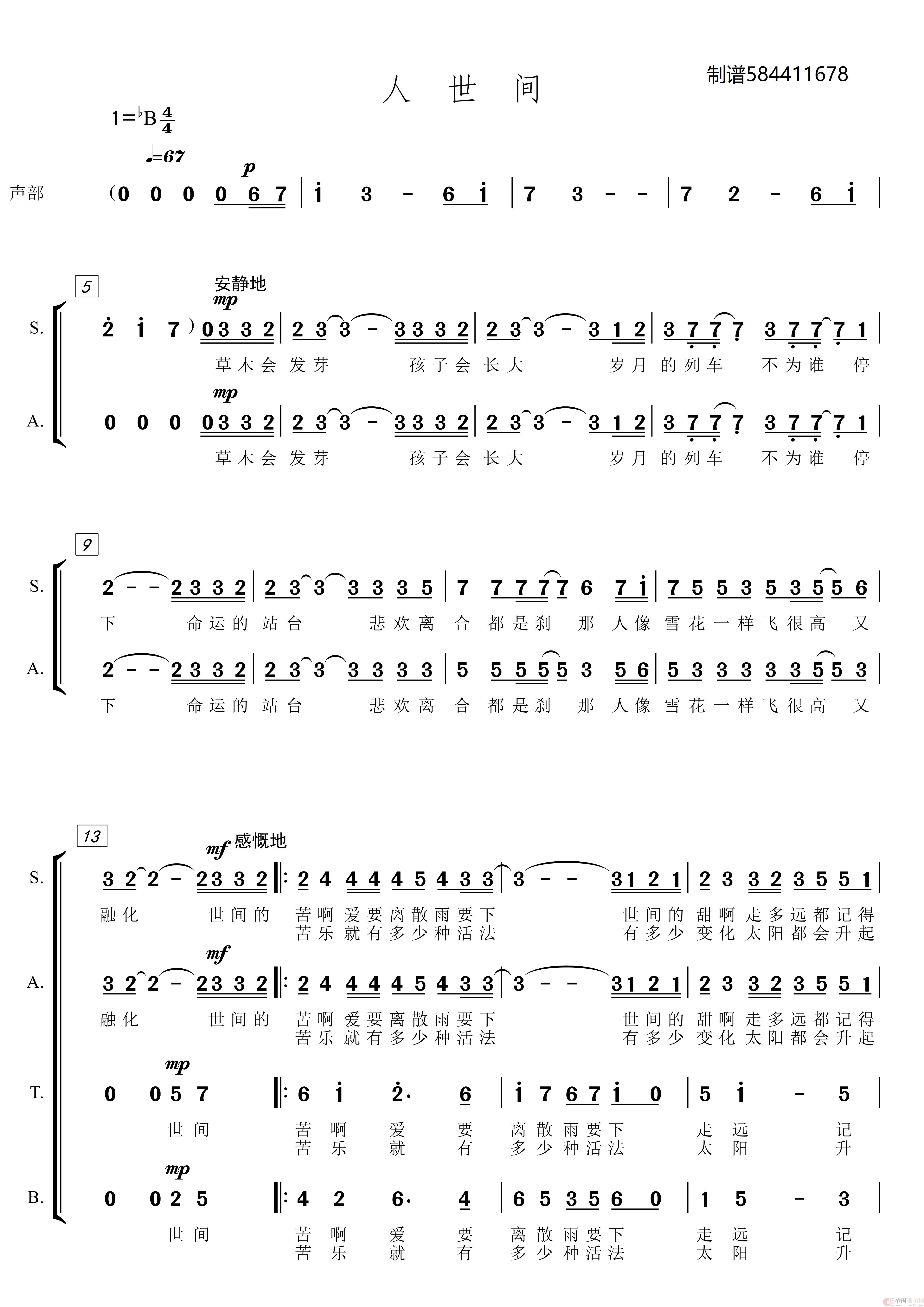 人世间混声四部合唱简谱