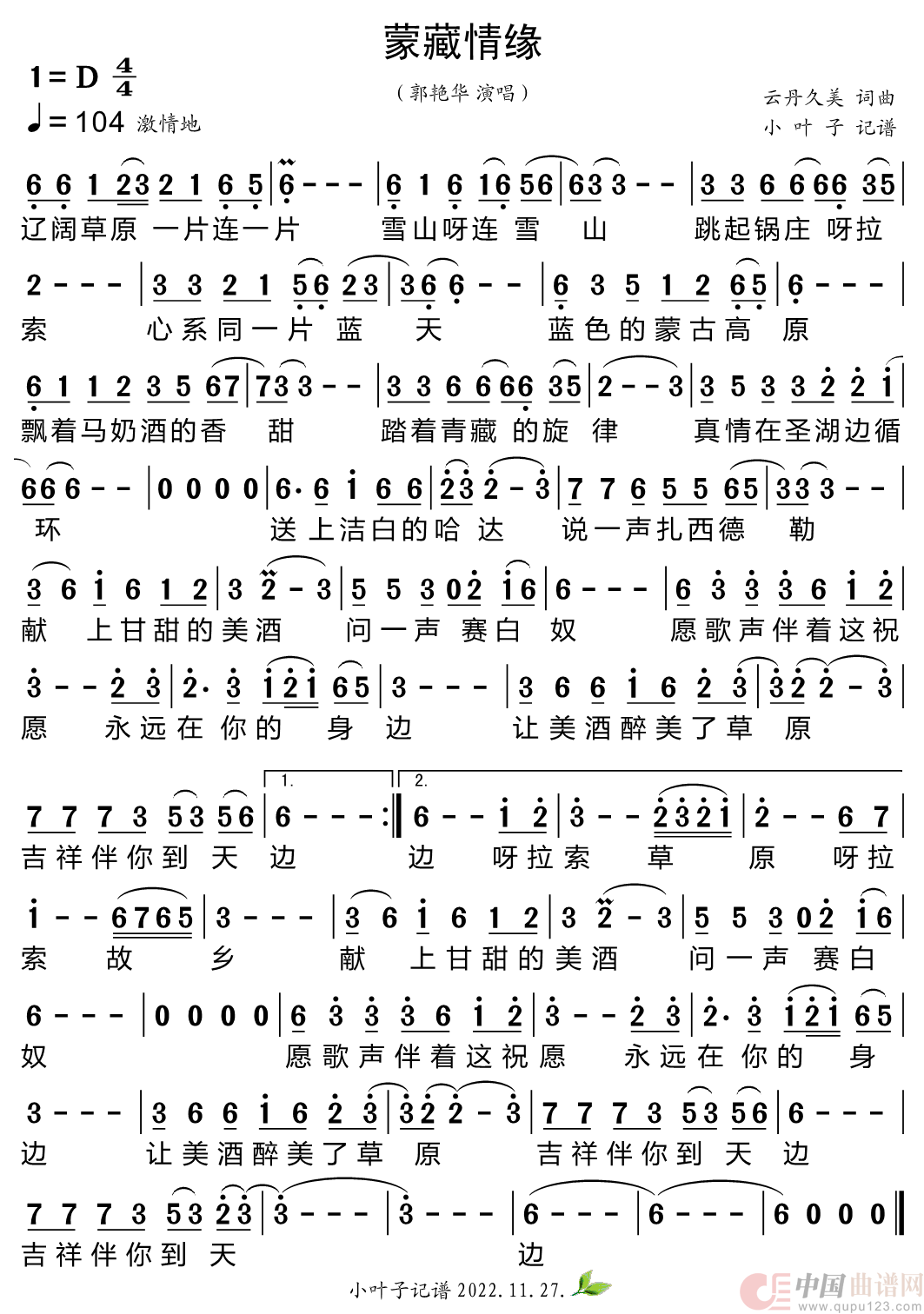 作词:云丹久美   作曲:云丹久美   演唱(奏):郭艳华   来源:搜谱网   上传:小花儿357   日期:2022-11-27   浏览次数:
