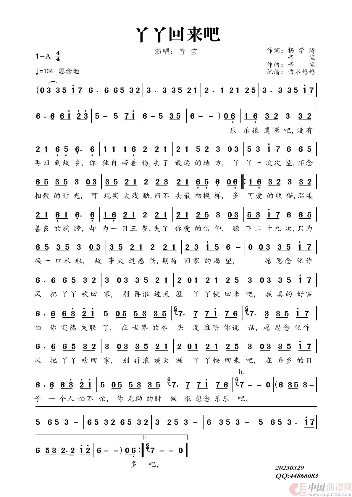 关于《丫丫回来吧》曲谱的评论