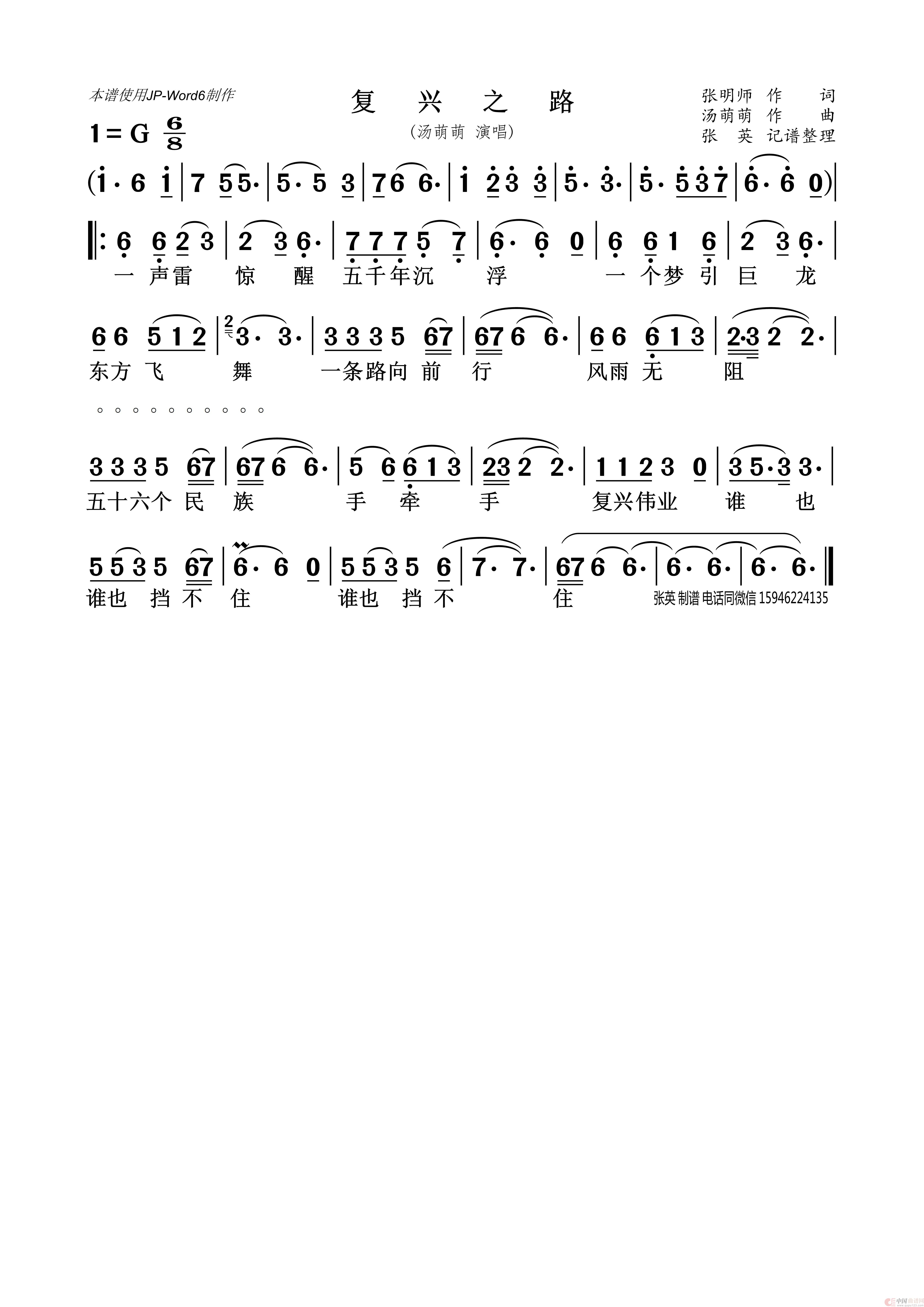 作词:张明师 作曲:汤萌萌 演唱(奏):汤萌萌 来源:张英记谱整理 上传:张英681004