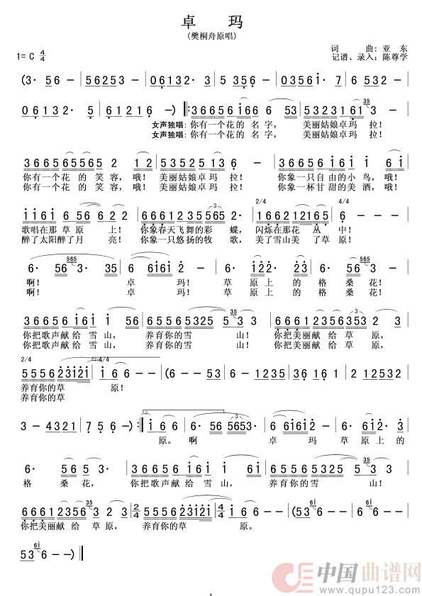 关于《卓玛(樊桐舟版)》曲谱的评论