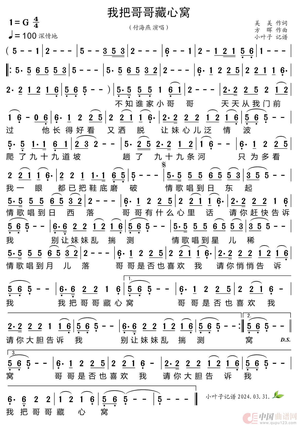 关于《我把哥哥藏心窝》曲谱的评论