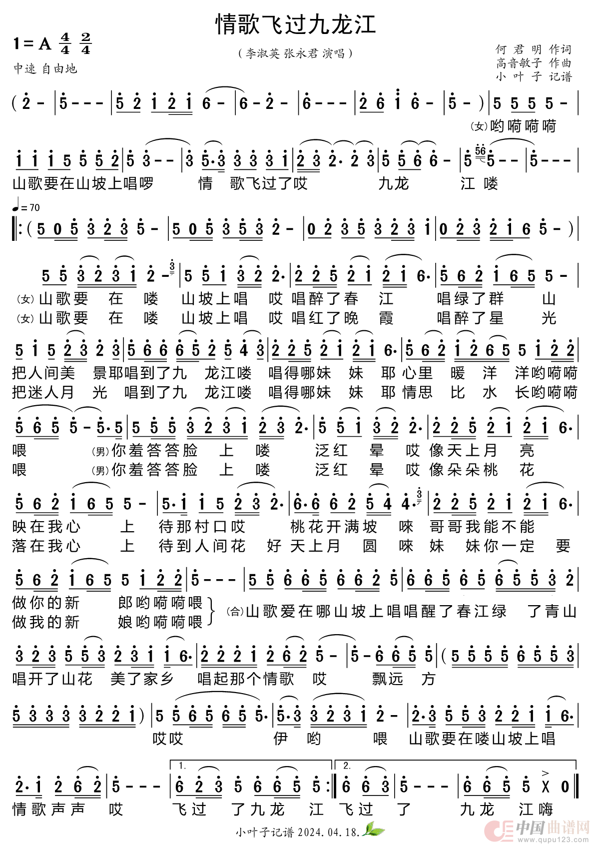 关于《情歌飞过九龙江》曲谱的评论