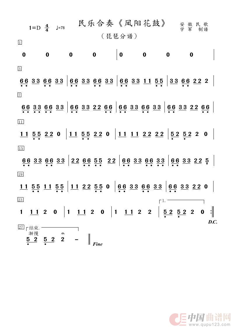 民乐合奏《凤阳花鼓》(琵琶分谱)