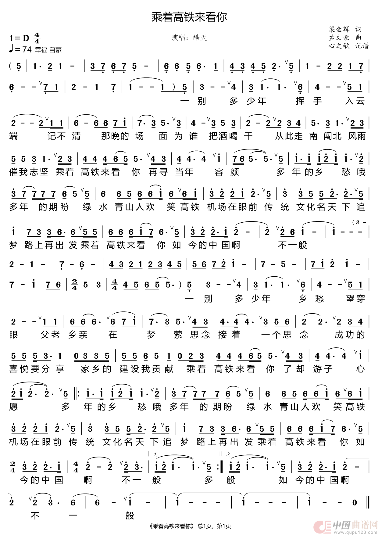 关于《乘着高铁来看你》曲谱的评论