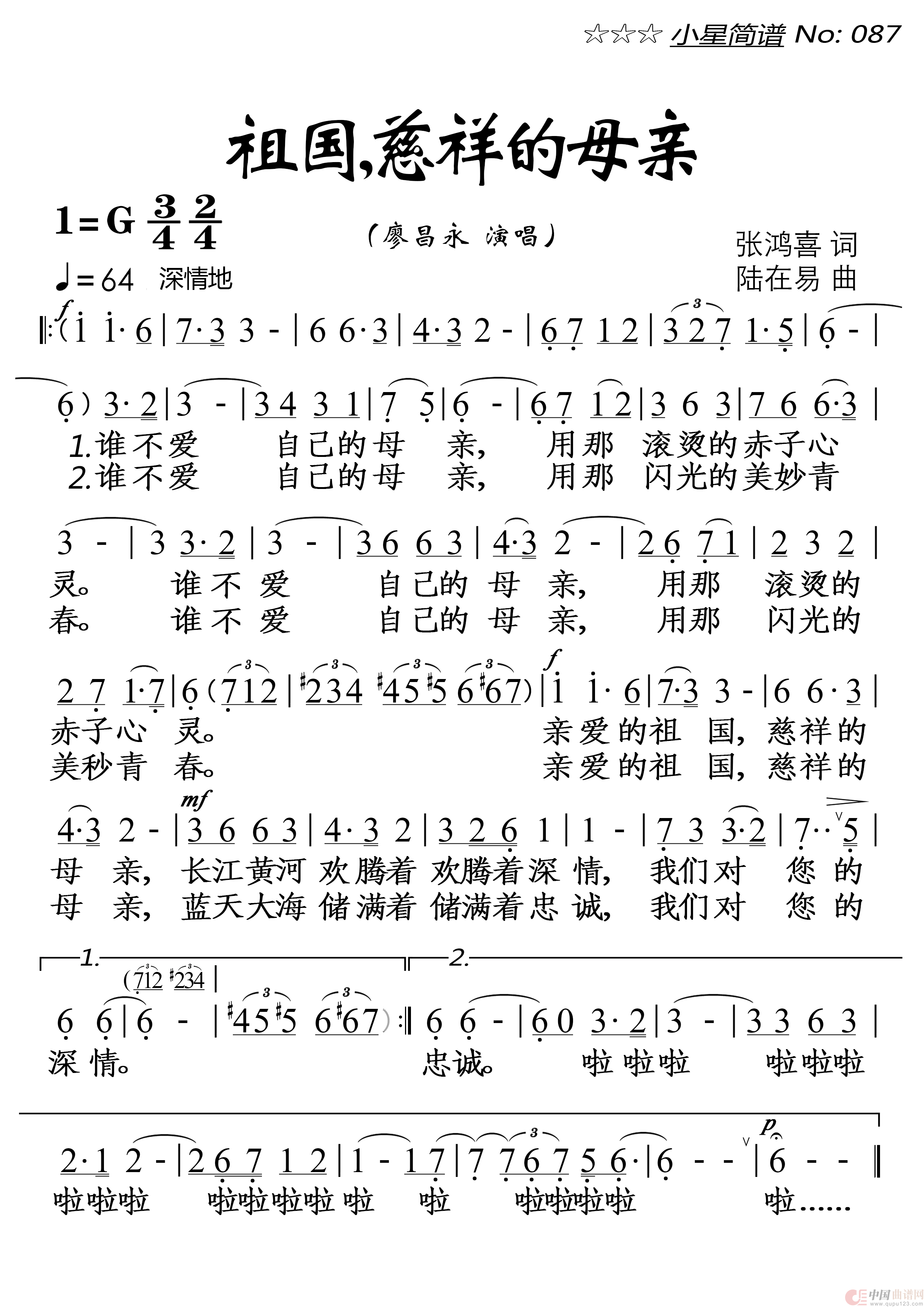 关于《祖国慈祥的母亲》曲谱的评论