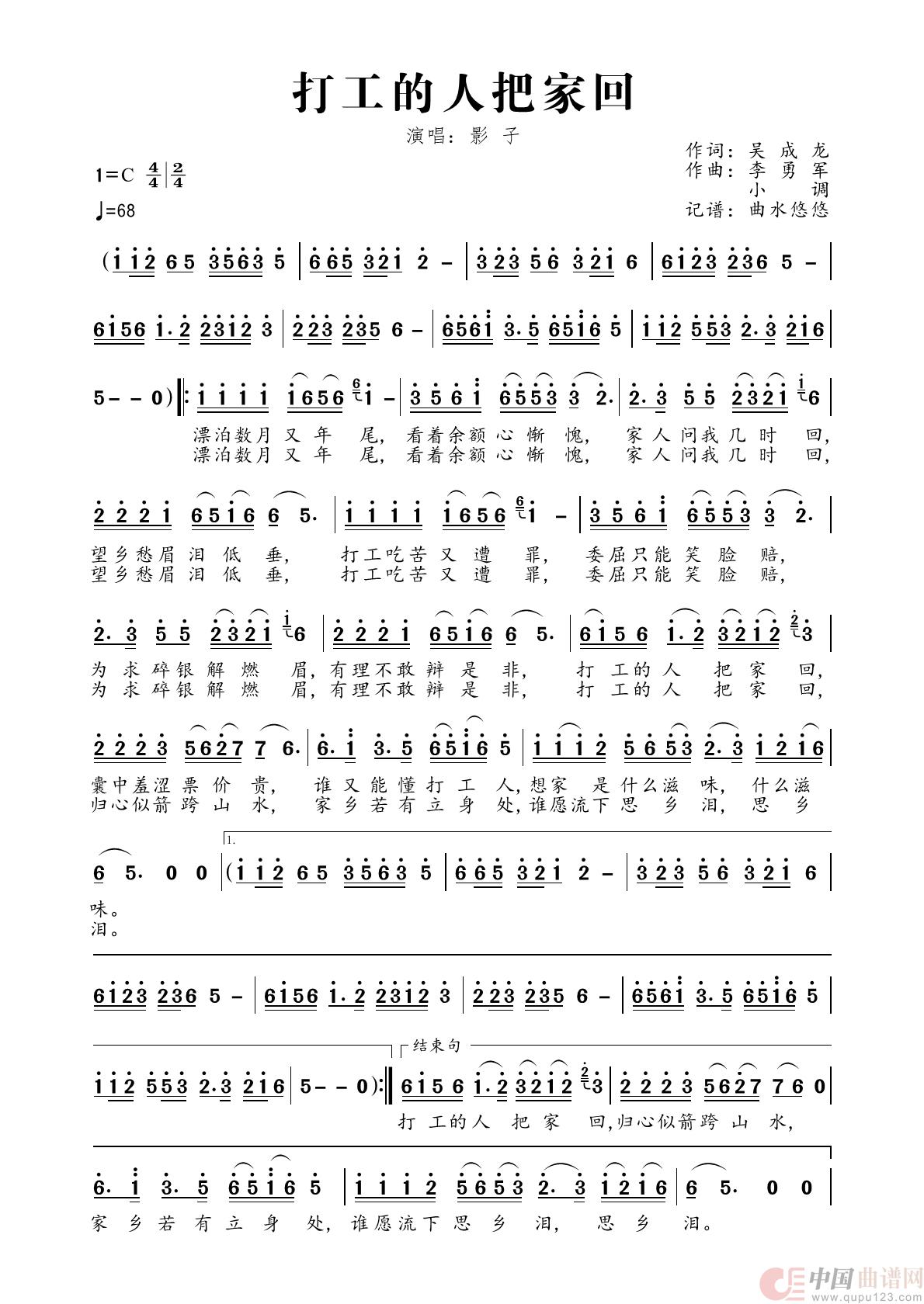 关于《打工的人把家回》曲谱的评论