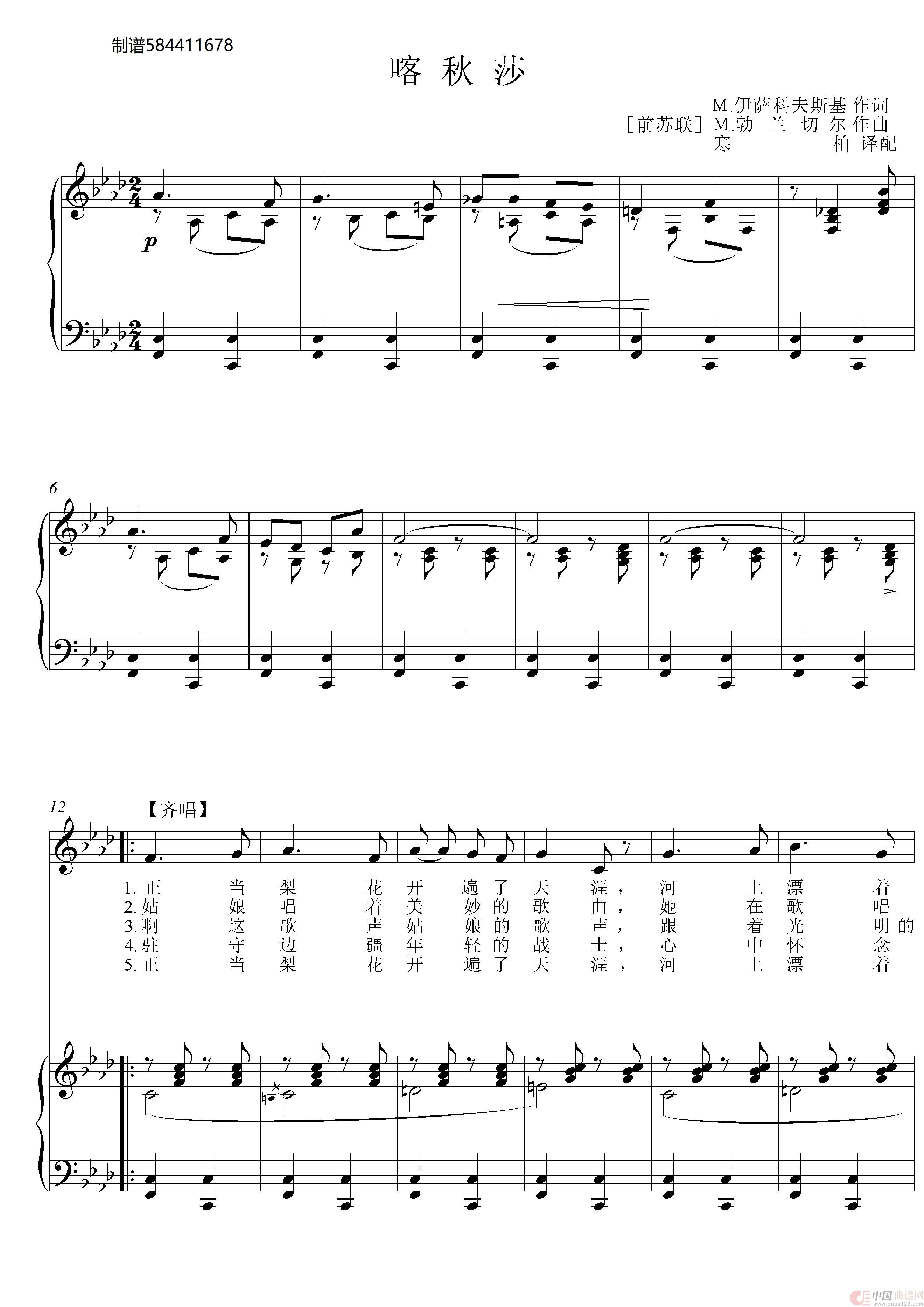 喀秋莎 二声部合唱谱