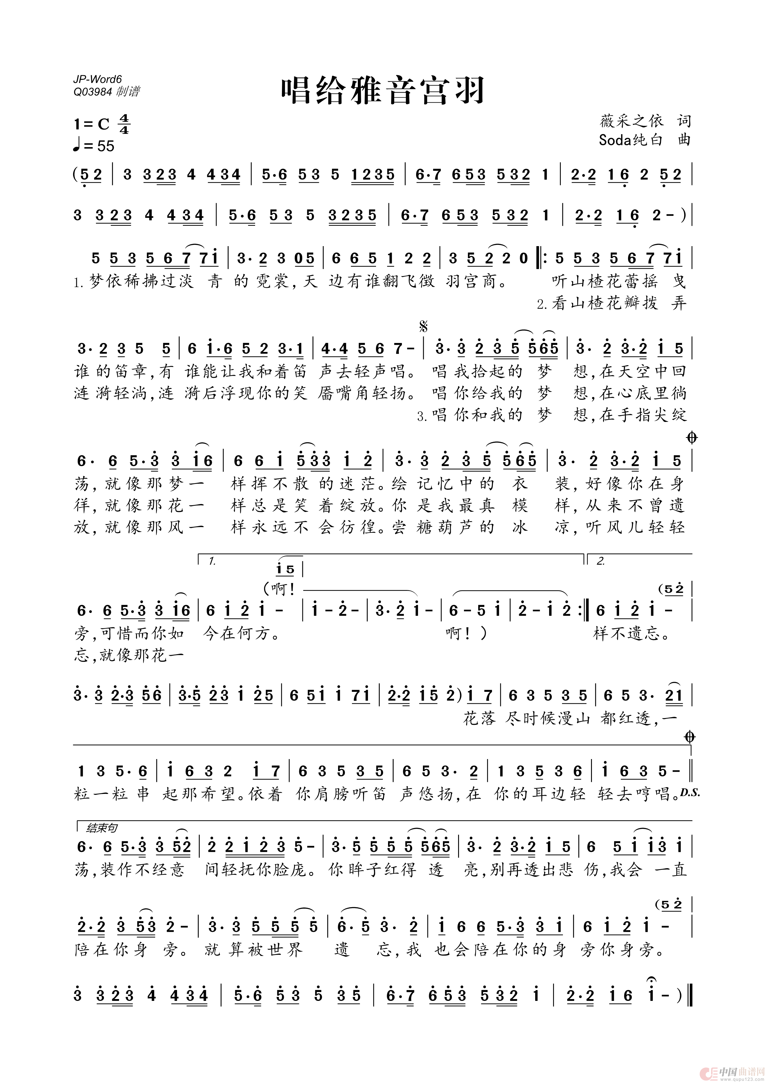作词:薇采之依 作曲:Soda纯白 演唱(奏):纯白P Jerrkiy commando1945 feat. 洛天依 来源:谱友q03984上传 上传:q03984