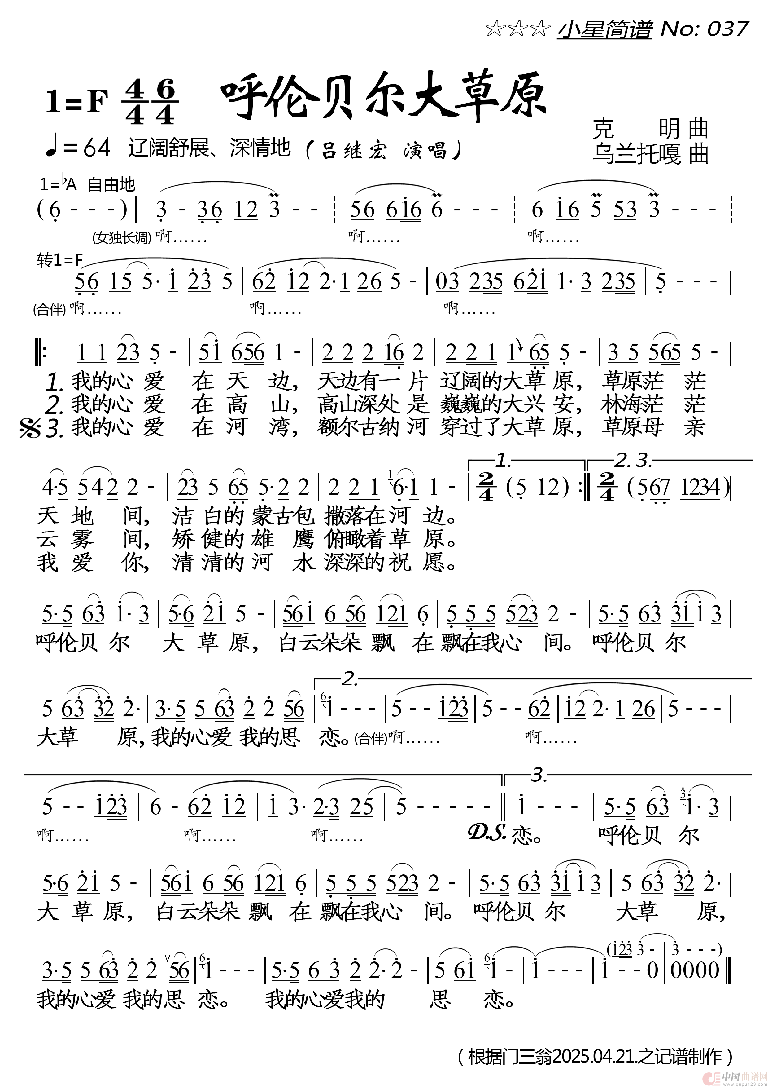 关于《呼伦贝尔大草原》曲谱的评论