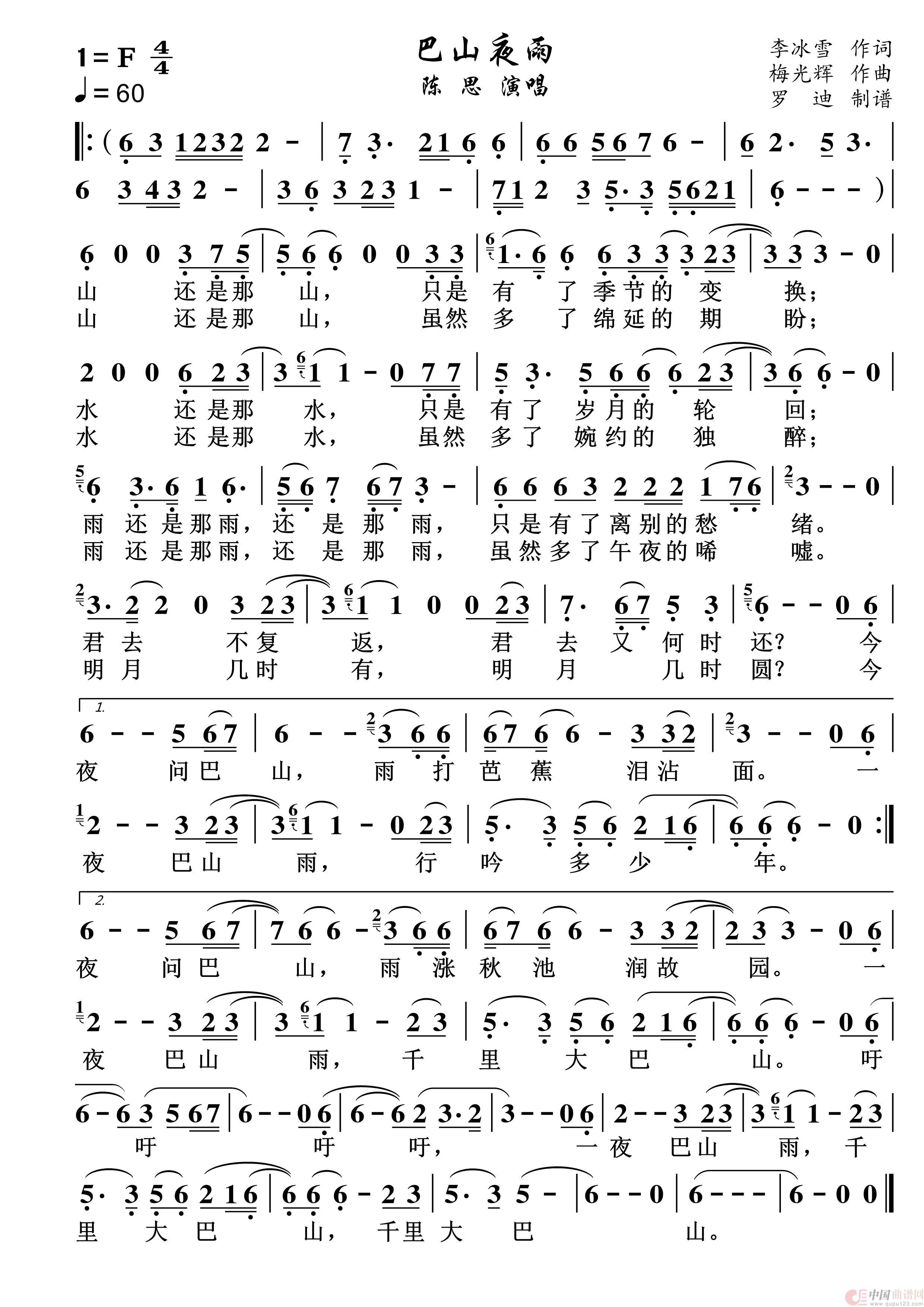 关于《巴山夜雨》曲谱的评论