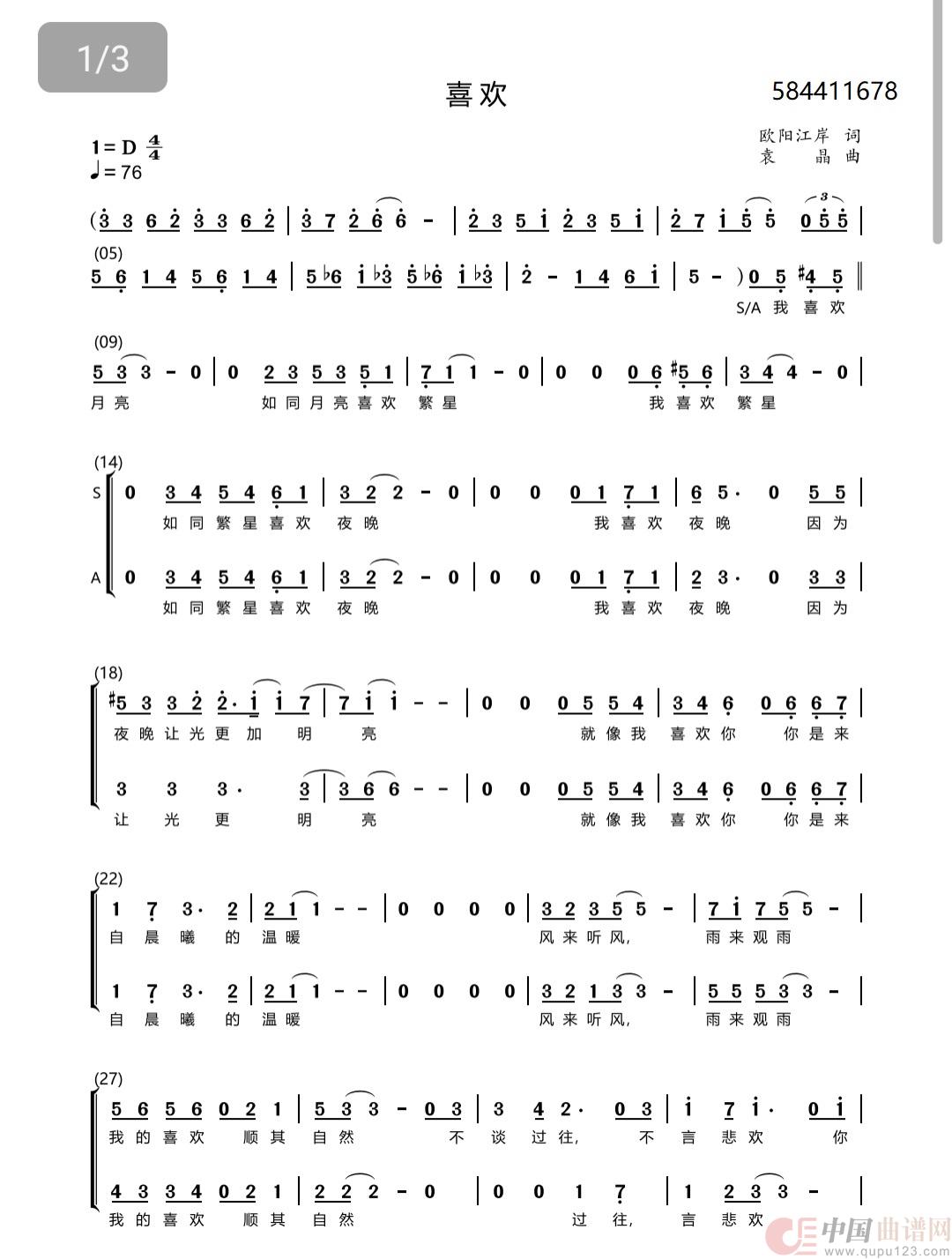喜欢二部合唱简谱