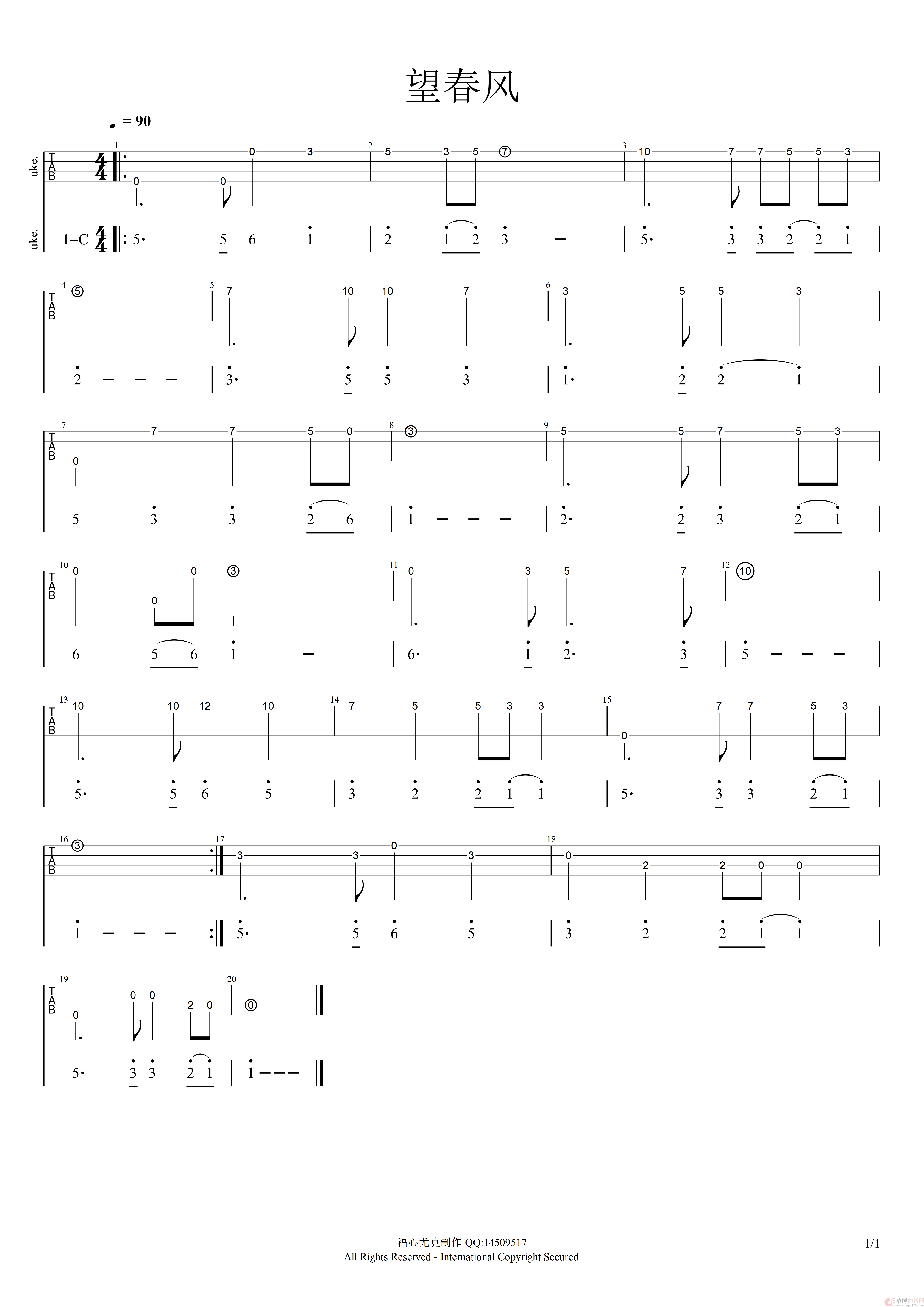 望春风(ukulele四线谱)
