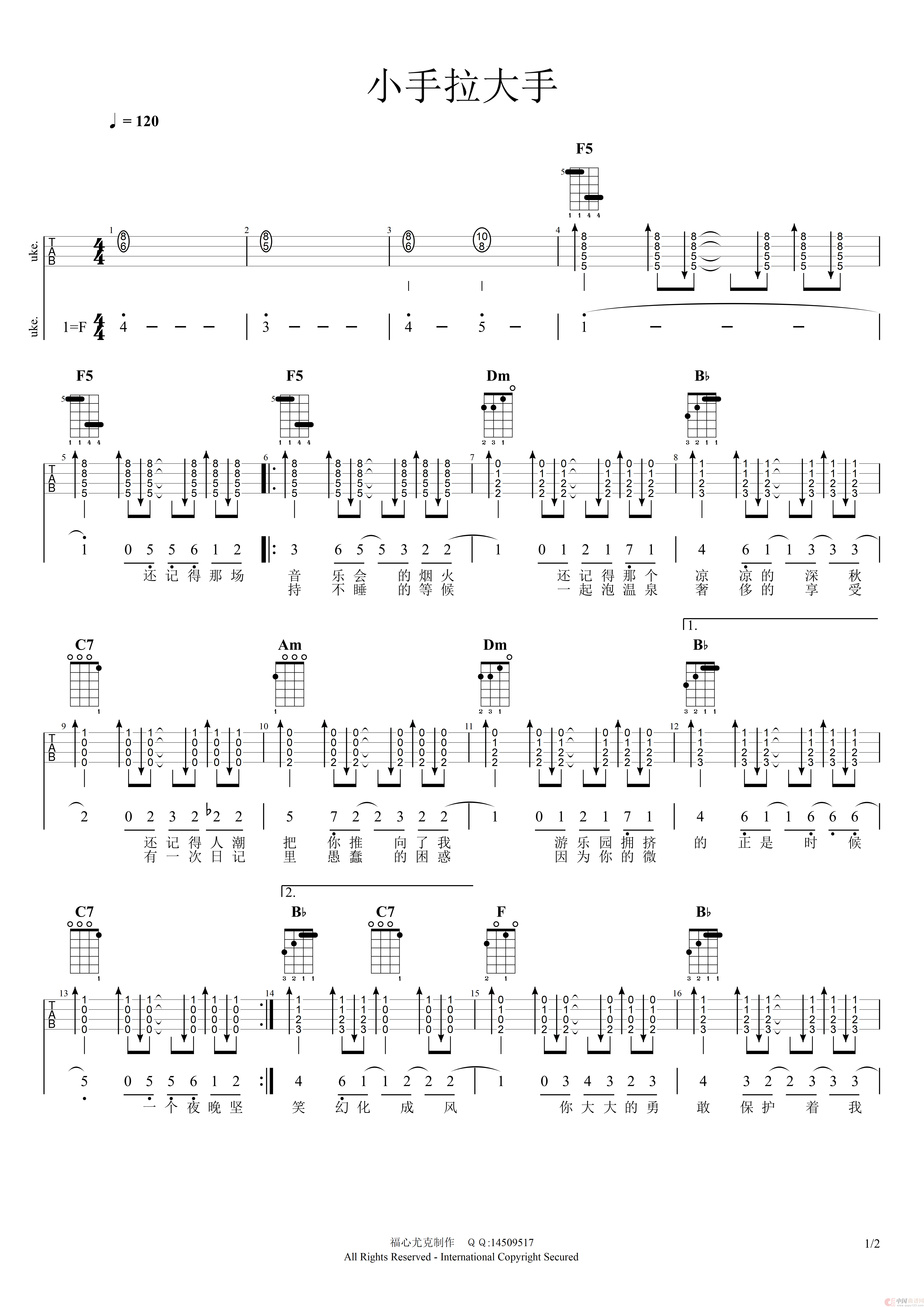 小手拉大手-男生版(ukulele四线谱)