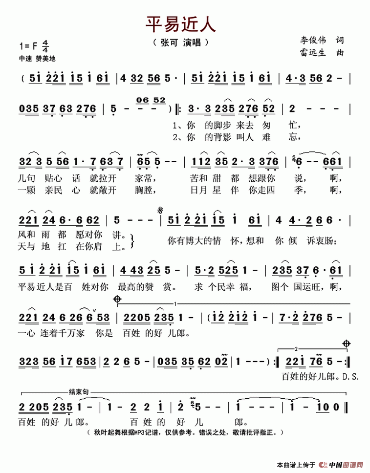 关于《平易近人》曲谱的评论