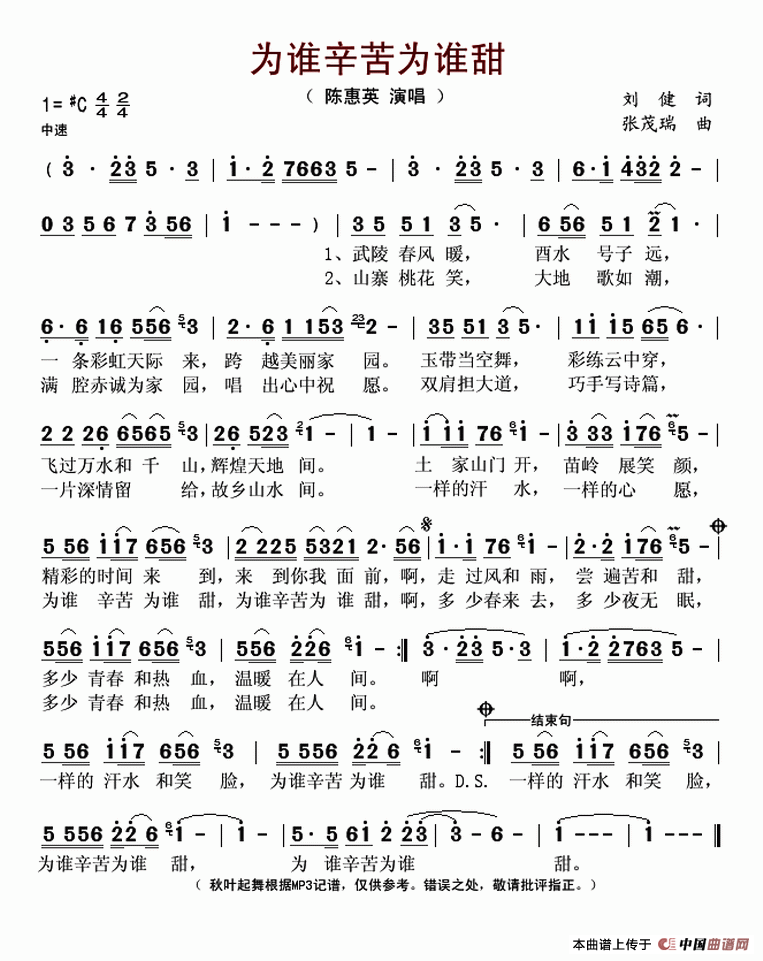 关于《为谁辛苦为谁甜》曲谱的评论