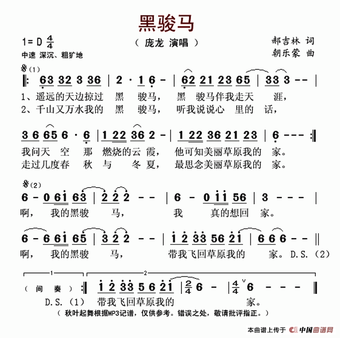关于《黑骏马》曲谱的评论