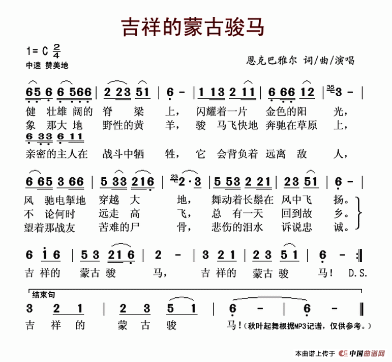 在一片金色阳光下,骏马驰骋在蒙古大草原上,长鬃飞扬,意气风发,无限忠诚。乐曲形象地描绘出骏马出征前马蹄踏地,嗒嗒作响的形态和跃跃欲试的神情,蒙古人民对骏马的喜爱和赞赏也通过清澈的旋律自然地表达出来。