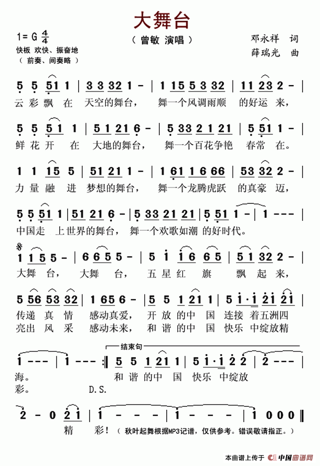 关于《大舞台》曲谱的评论
