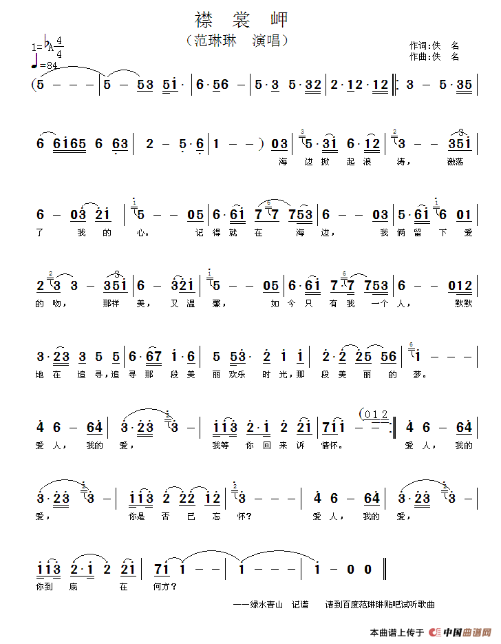 作词:佚名   作曲:佚名   演唱(奏):范琳琳   来源:绿水青山 记谱   上传:绿水青山   日期:2013-09-17   浏览次数: