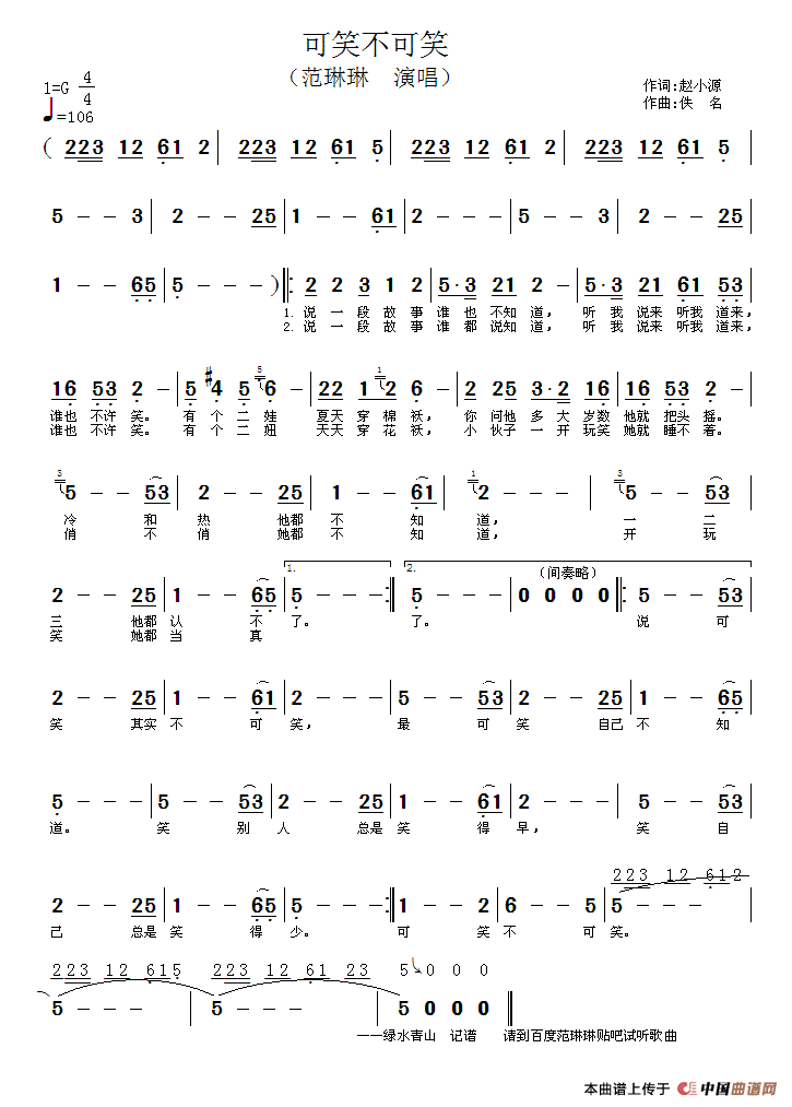 作词:赵小源   作曲:佚名   演唱(奏):范琳琳   来源:绿水青山 记谱   上传:绿水青山   日期:2013-09-17   浏览次数: