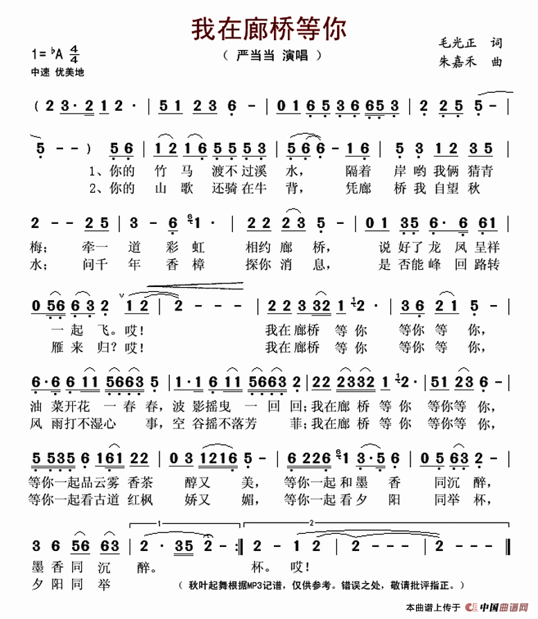 哎!我在廊桥等你、等你;风雨打不湿心事,空谷摇不落芳菲;我在廊桥等你、等你,