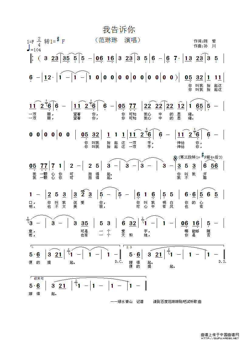 作词:陈哲   作曲:孙川   演唱(奏):范琳琳   格式:简谱   来源:谱友绿水青山   上传:绿水青山   日期:2011-10-10   浏览次数: