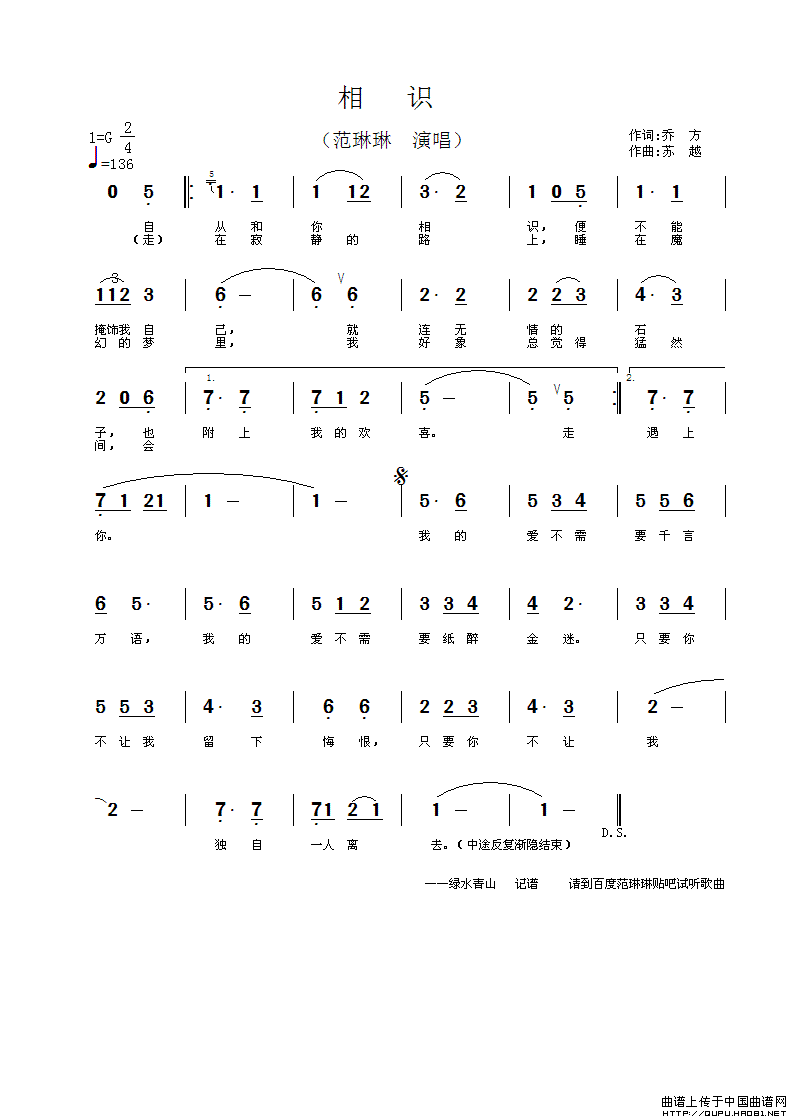作词:乔方   作曲:苏越   演唱(奏):范琳琳   格式:简谱   来源:谱友绿水青山   上传:绿水青山   日期:2011-10-10   浏览次数: