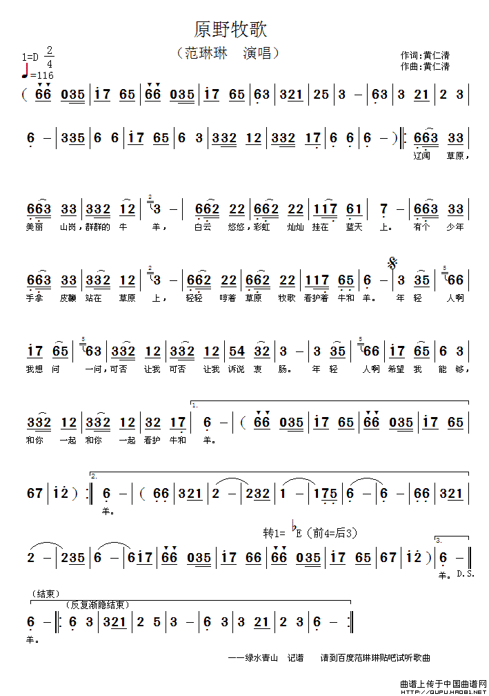 作词:黄仁清   作曲:黄仁清   演唱(奏):范琳琳   格式:简谱   来源:绿水青山 记谱上传    上传:绿水青山   日期:2012-01-31   浏览次数: