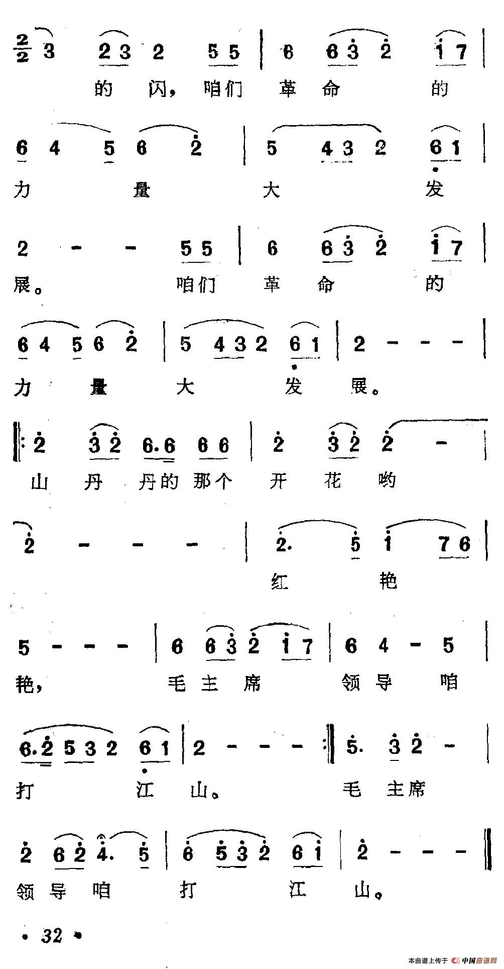 这首歌曲首唱是陕西省歌舞剧院合唱队,杨巧领唱,由李若冰、关鹤岩、徐锁、冯福宽作词,刘峰作曲,1971年发表。 [回复]