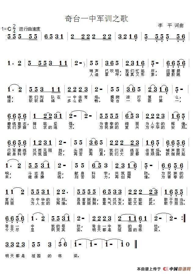 这首军训之歌是在奇台一中班主任哈巴斯老师的提一下,使我猛产灵感,由于军训满打满算只有5天时间,这怎么行呢?时间短任务重,不管怎么样,我都要克服一切重重困难将军训之歌展现在孩子们面前,可是给我的时间只有一天,于是我快速行动起来,利用上午的时间,边观察学生的训练情况与场地边写歌词,下午开始谱曲,晚上夜深人静的时候一边修改一边做伴奏,直到满意为止。紧接着我与画桥烟柳老师联系,幸好她还没睡觉,我把情况说了一遍,她二话没说,一口答应:“明天放下一切,先录您的歌”。当时我很感动,只说了一声谢谢!!!第二天上午她就圆满的交了答卷。领导们通过视听感到非常满意。将歌曲安排在军训闭幕式上让师生们聆听。今天,短暂紧张的军训闭幕式结束了,我把这首《奇台一中军训之歌》上传基地,在此感谢画桥烟柳老师的热情帮助与优美纯真的歌声!!!也欢迎朋友们多提宝贵意见与建议。