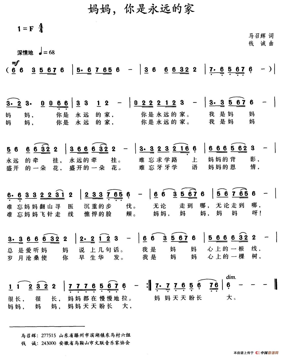 《妈妈,你是永远的家》马召辉词 钱 诚曲 发表在《当代音乐》2014年11期p76