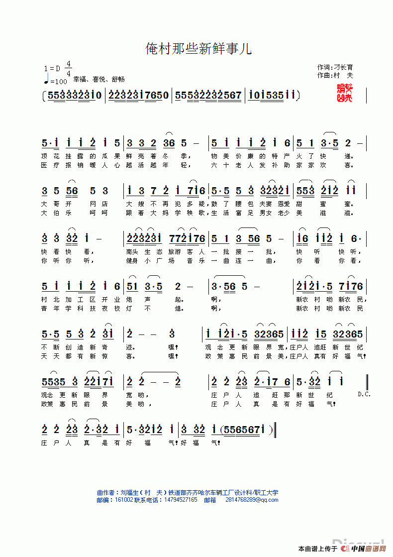 百度搜索时无意看到村夫老师为我的拙作《村里那些新鲜事》谱曲,非常高兴。
